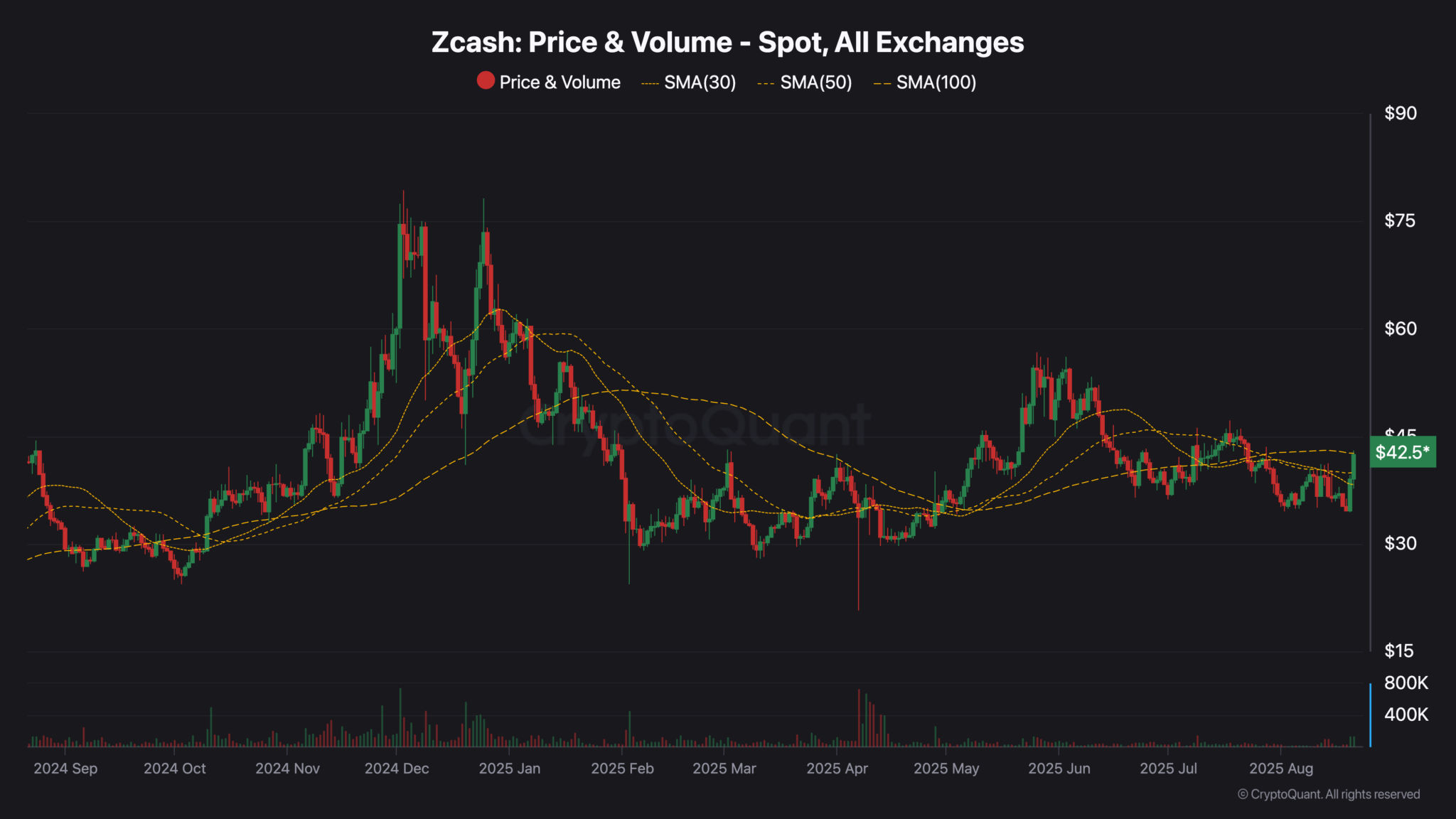 Der Chart des ZCash-Kurses zeigt eine ermutigende Dynamik. Auf Tagesbasis schloss der Coin am 21. August bei 42,54 $ und notierte damit über dem 30-Tage-SMA (38,29 $) und dem 50-Tage-SMA (39,99 $), während er den 100-Tage-SMA (42,65 $) berührte.