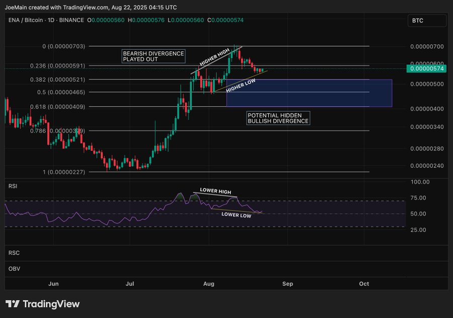 Auch auf dem ENA/BTC-Chart gibt es ein interessantes Setup. Die frühere bärische Divergenz scheint sich vollständig ausgespielt zu haben, und das Paar könnte nun eine versteckte bullische Divergenz bilden. Dies geschieht, wenn der Preis ein höheres Tief erreicht, der RSI jedoch ein niedrigeres Tief erreicht, was oft einen Reset signalisiert, bevor es zu einer weiteren Aufwärtsbewegung kommt.