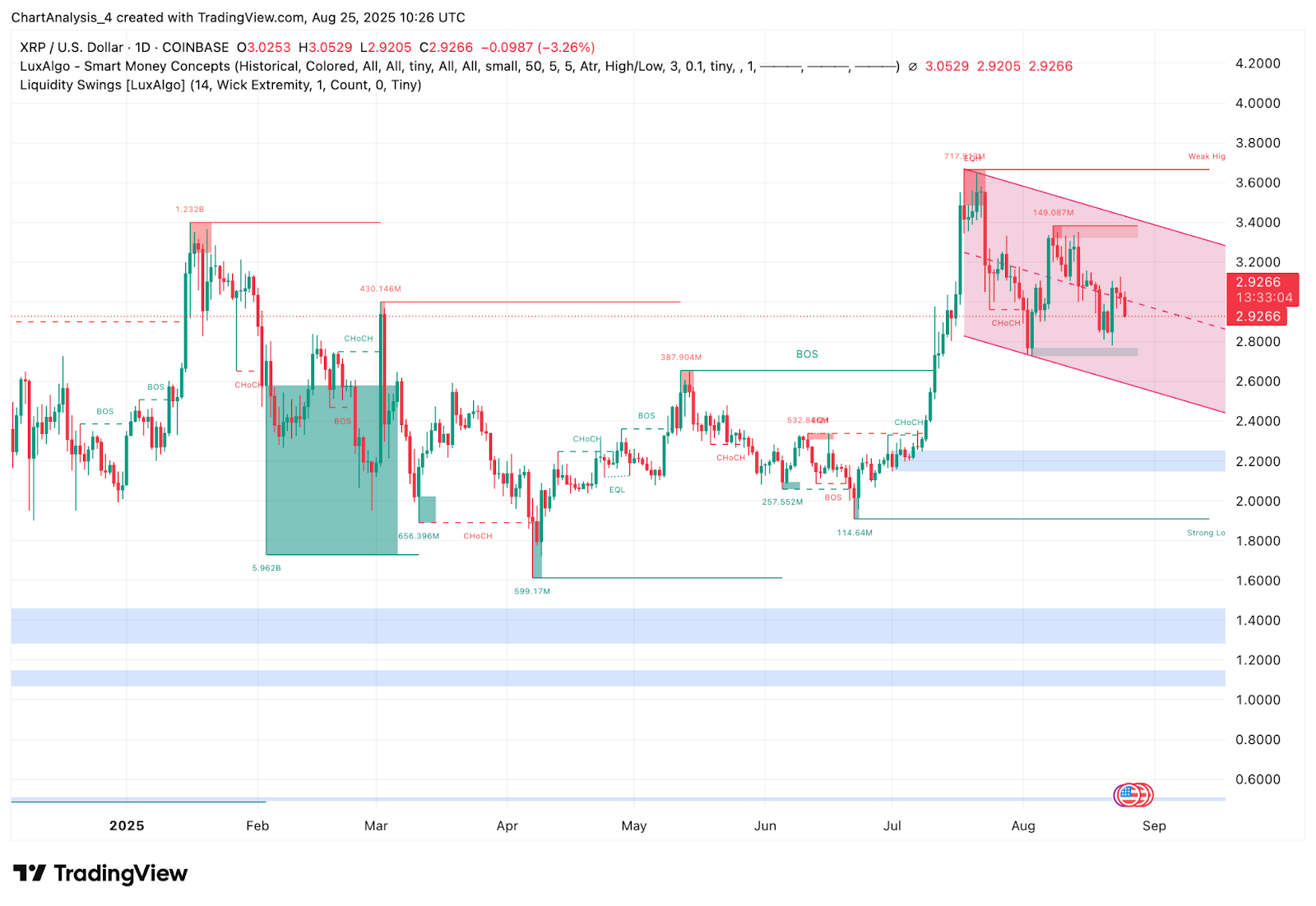 Auf dem Tages-Chart zeigen die Strukturen des Smart Money Concept (SMC) mehrere CHoCH-Muster innerhalb des absteigenden Kanals, mit einem sichtbaren schwachen Hoch um 3,60 $. Solange XRP diesen Kanal nach oben nicht überwindet, bleibt die Marktstruktur in Richtung angebotsgetriebener Rückgänge tendiert.