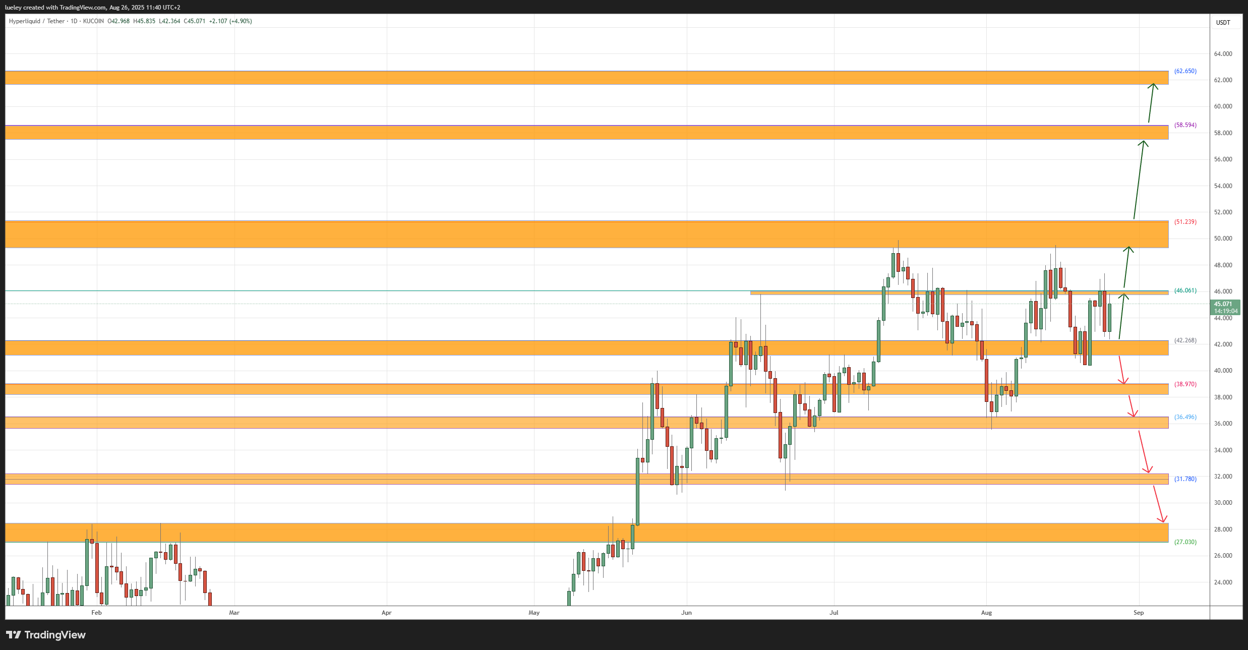 - Anleger scheinen die Stärke der DEX zu honorieren und konnten den HYPE-Kurs zuletzt oberhalb des Supportbereichs zwischen 42,29 US-Dollar und 41,19 US-Dollar stabilisieren.