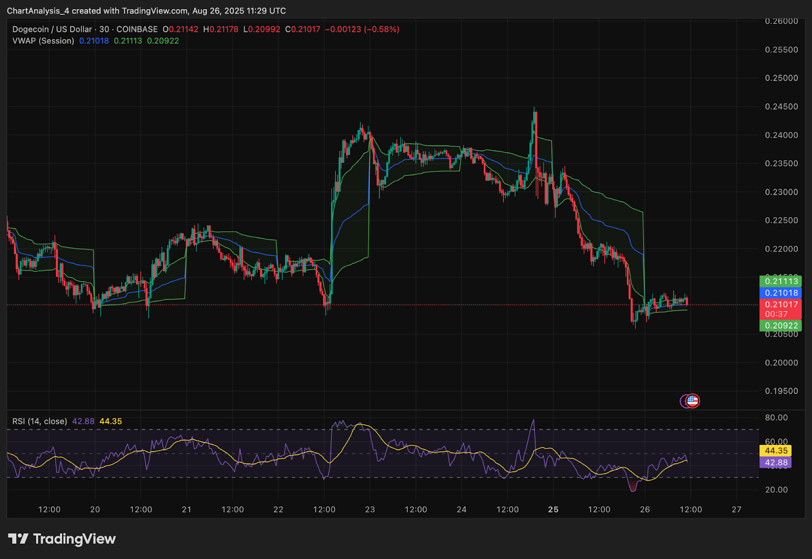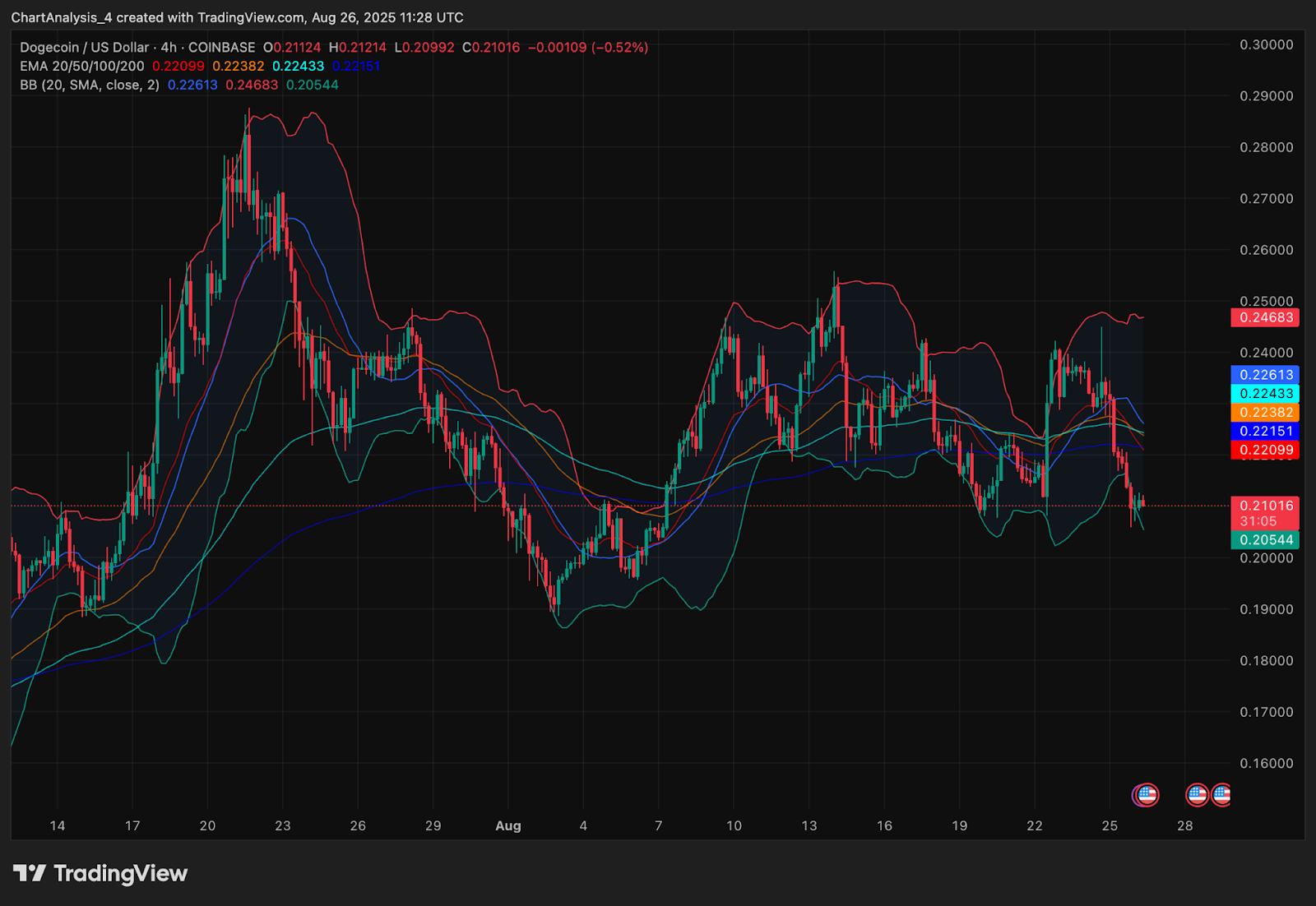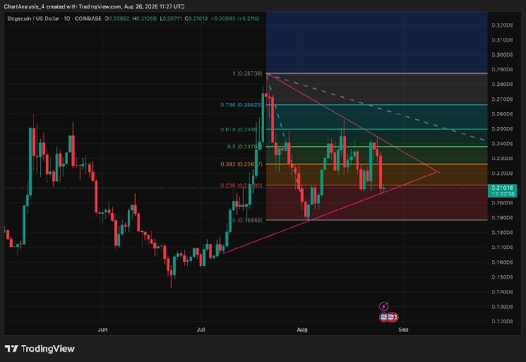 Der Dogecoin-Preis wird heute bei 0,210 $ gehandelt und konsolidiert sich innerhalb eines breiten symmetrischen Dreiecks, das die Aktion im August geleitet hat. Die Struktur verengt sich, wobei höhere Tiefs auf einen absteigenden Widerstand bei 0,226 $ treffen. Diese Kompression deutet darauf hin, dass sich ein Ausbruch nähert, wobei 0,226 $ der erste Aufwärtsschwenk und 0,206 $ die unmittelbare Basis ist, die es zu verteidigen gilt.