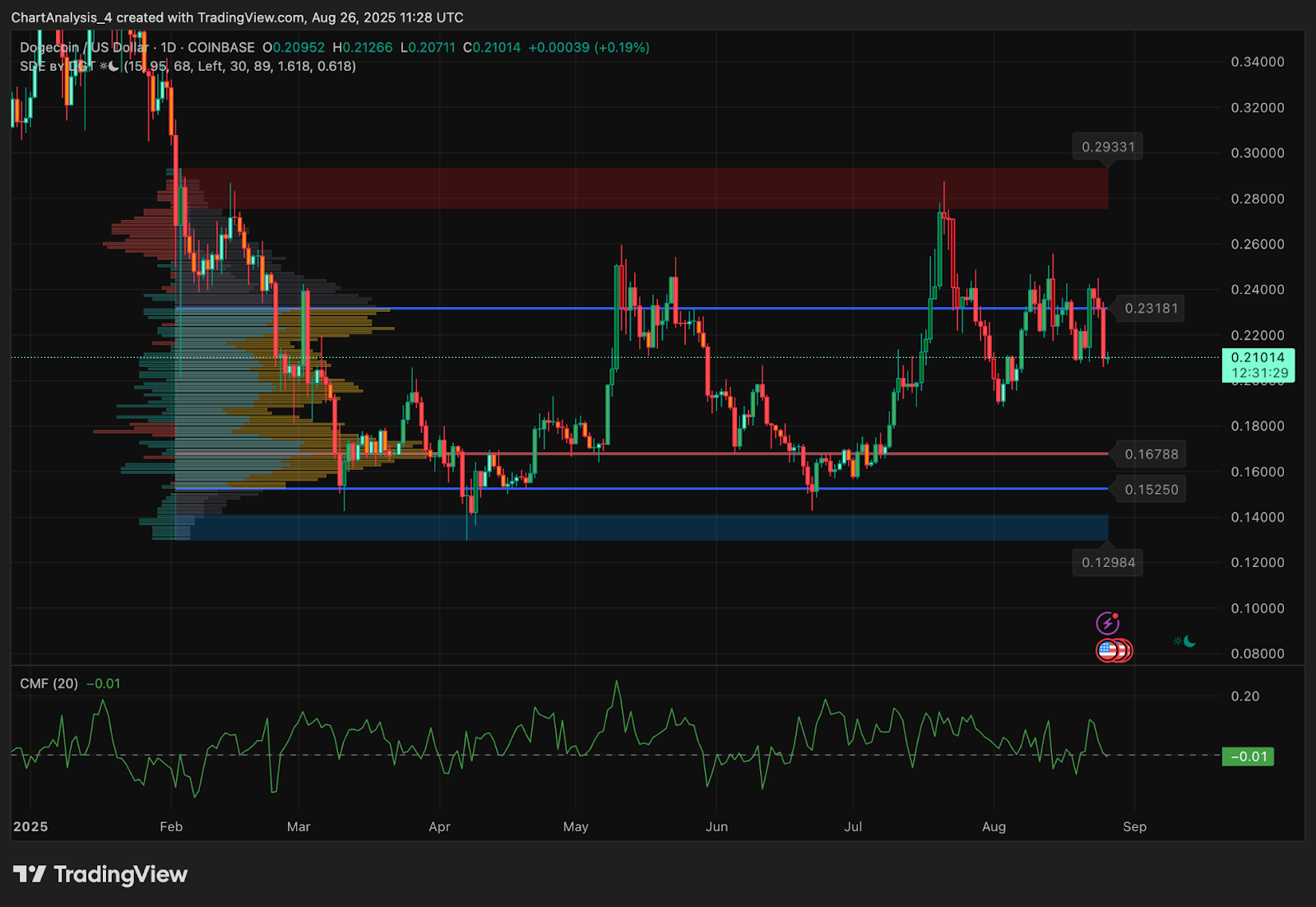 Der VWAP auf den Intraday-Charts hält sich bei 0,211 $ und hält DOGE an kurzfristige Durchschnittsniveaus gebunden. Solange der Kurs nicht mit Überzeugung über diese Zone steigt, bleiben Erholungssignale aus. Der Chaikin Money Flow auf dem Tages-Chart liegt bei -0,01, was gedämpfte Zuflüsse zeigt und den Mangel an starker Akkumulation verstärkt.