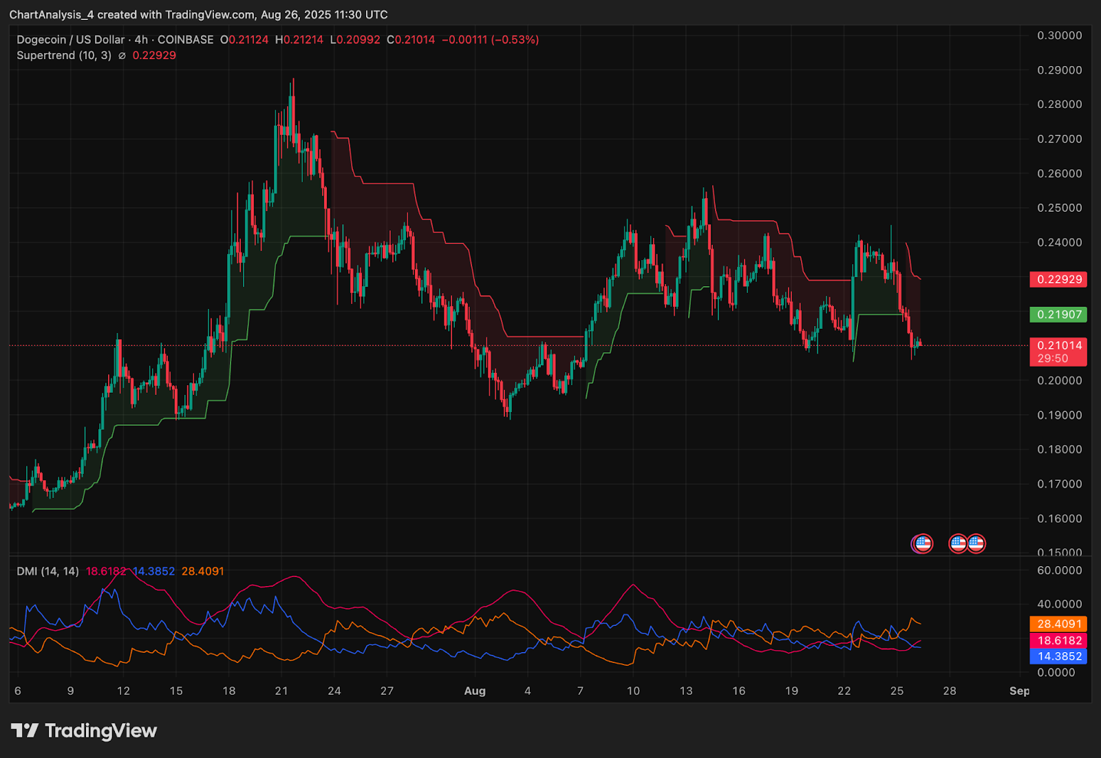 Der Rückgang des Dogecoin-Preises ist auf die nachlassende Dynamik und die Ausrichtung der rückläufigen Indikatoren zurückzuführen. Auf dem 4-Stunden-Chart wird DOGE unter seinem 20/50/100 EMA-Cluster gehandelt, wobei sich die Bollinger-Bänder nach unten ausweiten, was auf eine erhöhte Volatilität nach unten hindeutet. Der Supertrend-Indikator bleibt unter 0,229 $ rückläufig, was den Widerstand über dem Kopf verstärkt.