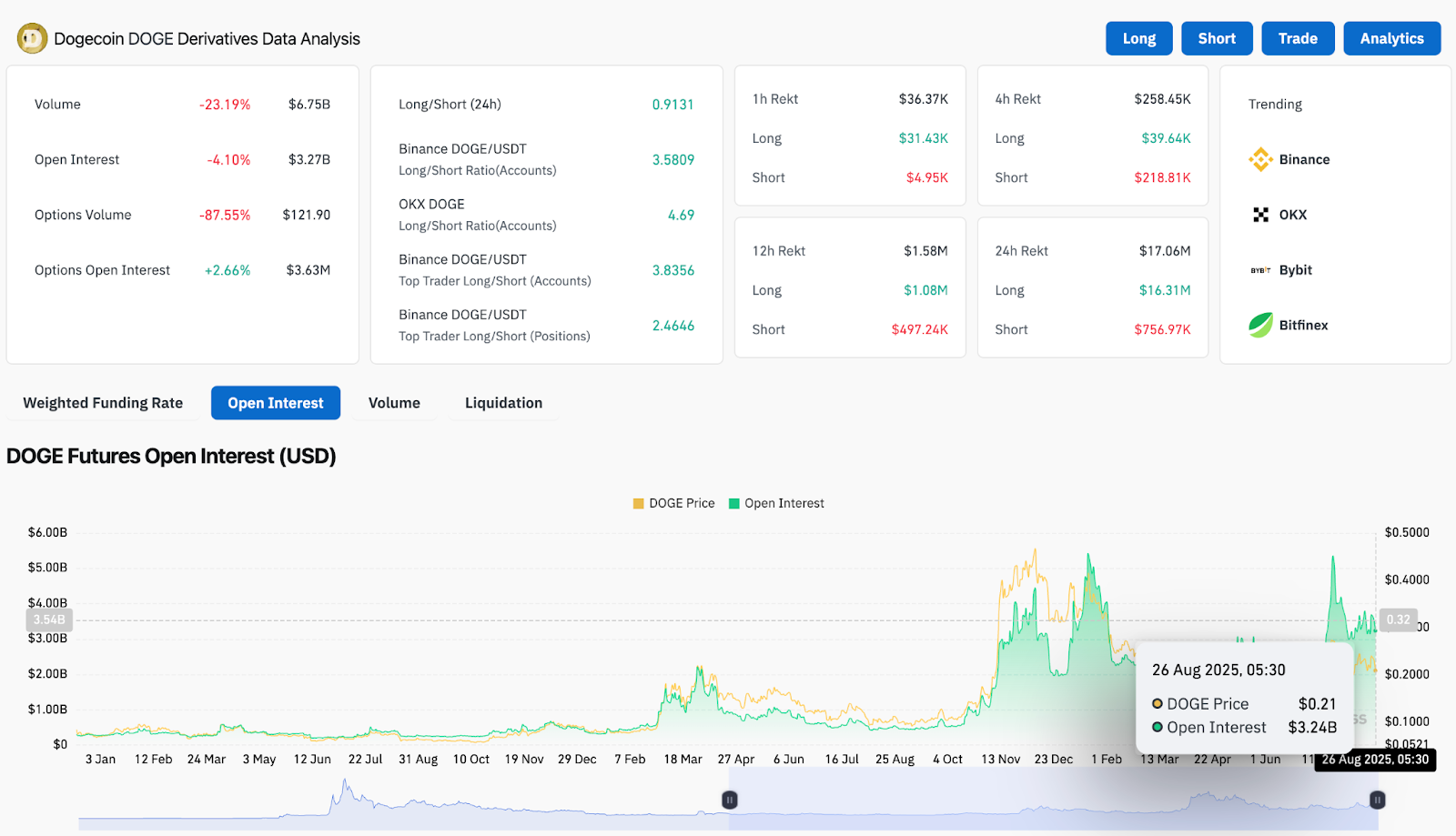 Auf dem Tages-Chart hält DOGE die Zone von 0,21 $ und liegt damit im Einklang mit dem 0,236 Fibonacci-Retracement bei 0,218 $. Wiederholte Rebounds von diesem Niveau bestätigen das starke Käuferinteresse, obwohl der Überkopfwiderstand bei 0,226 $ (Fib 0,382) jeden Rallyeversuch in diesem Monat gedeckelt hat. Darüber liegen die nächsten Hürden bei 0,238 $ (Fib 0,5) und 0,249 $ (Fib 0,618).