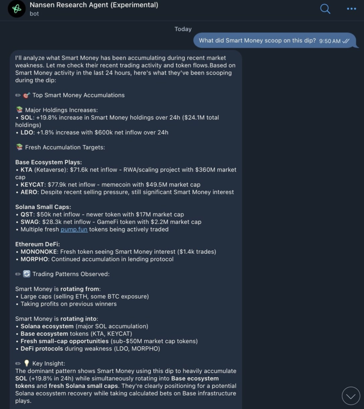 Es ist auch interessant zu sehen, was den aktuellen Anstieg verursacht. Laut dem AI Research Agent von Nansen steigt das kluge Geld, die Whales, massiv in Solana ein. In den letzten 24 Stunden erhöhte sich der Anteil dieser Gruppe in SOL um fast 20 Prozent. Es scheint eine klare Rotation von Ethereum (ETH) und Bitcoin (BTC) zu Solana stattzufinden.