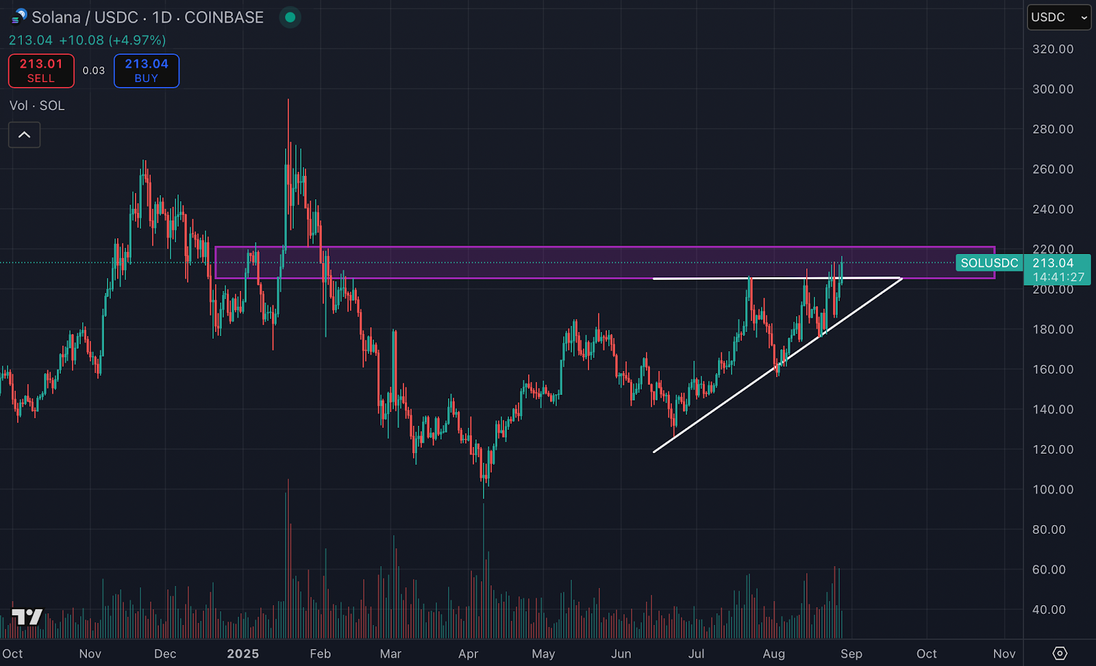 Solana (SOL) erlebt eine starke Woche. Seit dem Tiefpunkt am 26. August stieg SOL um mehr als 15 Prozent und durchbrach dabei die wichtige Marke von 200 Dollar. Derzeit handelt der Kurs bei etwa 215 Dollar. Wie weit kann der Kurs jetzt steigen?