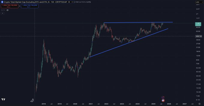 Weiterhin teilt er die obenstehende Grafik des Gesamtmarktwertes für Krypto abzüglich Bitcoin und Ethereum. Es geht also um den Wert aller kleineren Münzen auf dem Markt, und dieser scheint derzeit eine Art Ausbruch zu bilden.