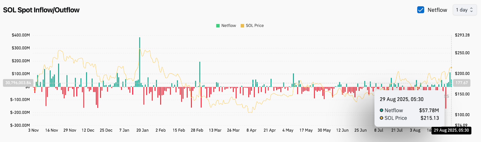 Gleichzeitig ist die Aktivität der Wale sprunghaft angestiegen. Die Spot-Zuflüsse am 29. August zeigten einen Netto-Gewinn von 57,7 Mio. $, was einen der stärksten Akkumulationstage in diesem Quartal markiert. Anhaltende Zuflüsse über 200 $ deuten darauf hin, dass große Akteure trotz der allgemeinen Marktvolatilität von der Widerstandsfähigkeit von Solana überzeugt sind.