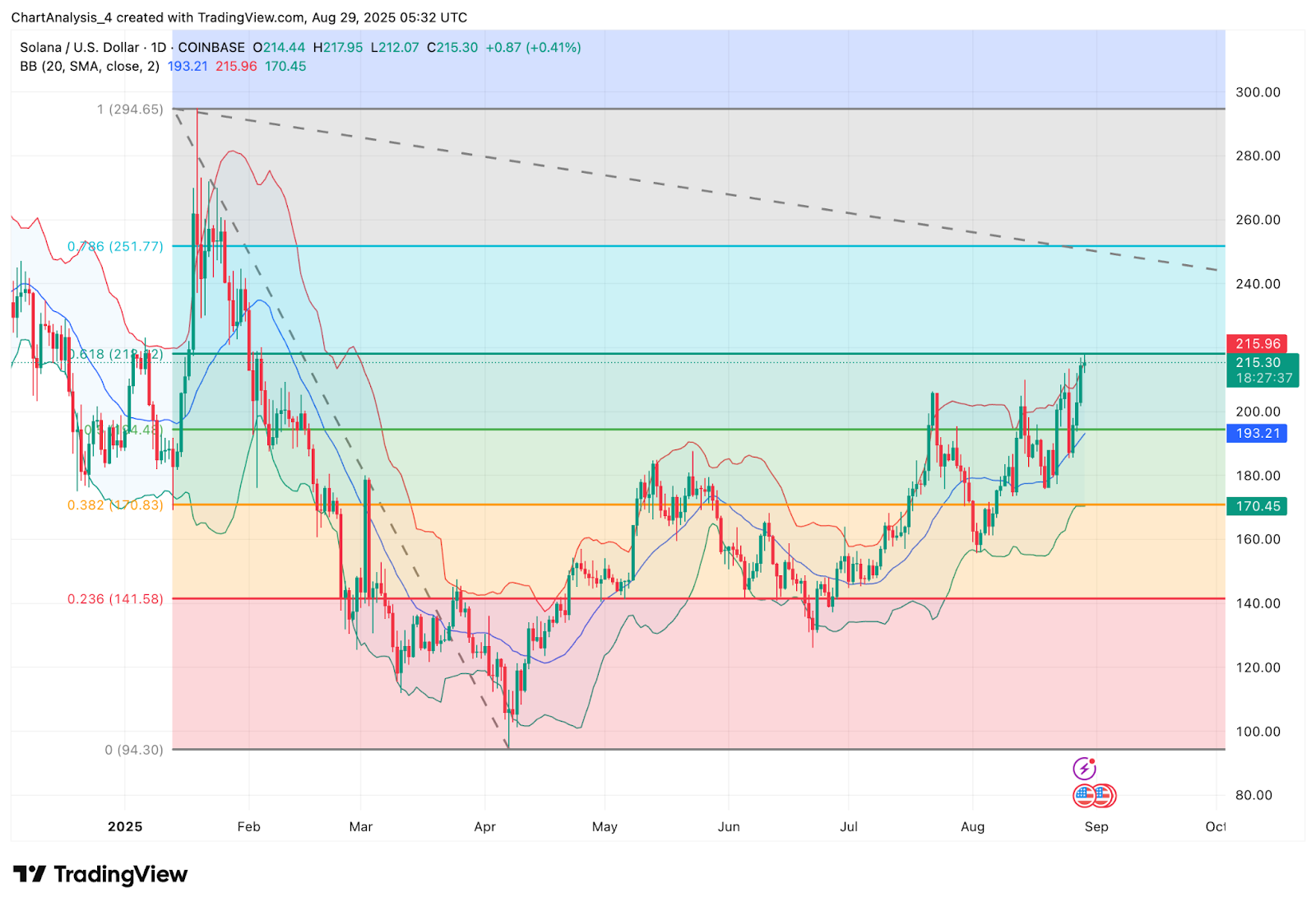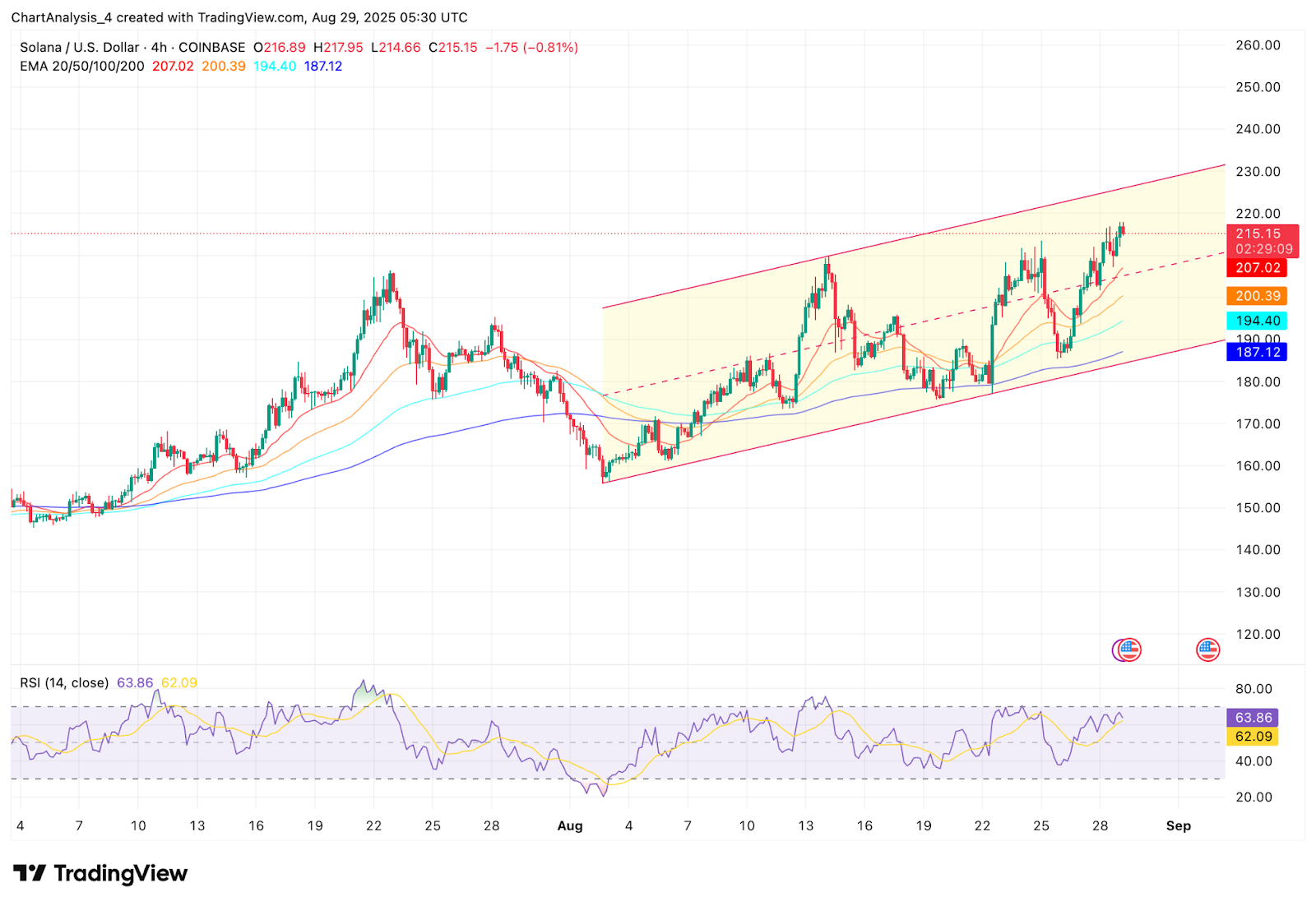 Der Solana-Preis wird heute in der Nähe von 215 $ gehandelt und hält seine Gewinne nach einer starken Erholung im August, die den Token aus der Juli-Zone von 170 $ anhob. Der jüngste Anstieg spiegelt eine Kombination aus technischem Momentum und erneuter fundamentaler Unterstützung wider, wobei die Käufer versuchen, den Preis in Richtung der Region von 220 $ bis 225 $ zu treiben.
