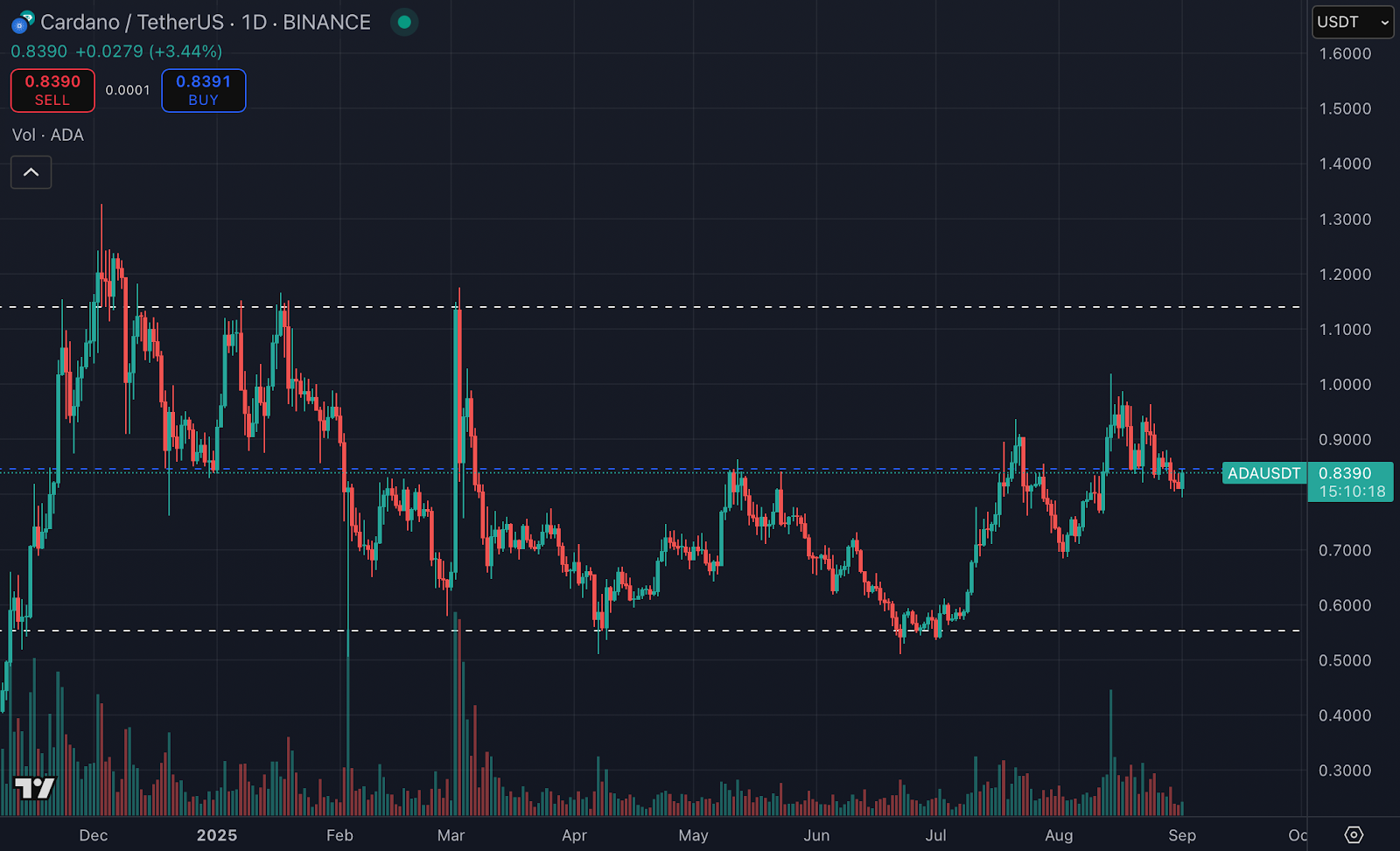 Laut Erik Juffermans, technischer Analyst bei Newsbit, bewegt sich Cardano (ADA) seit Dezember in einem klaren Kanal zwischen 0,50 und 1,10 Dollar. Im Juli bildete der Kurs ein Doppelboden, woraufhin ADA innerhalb von anderthalb Monaten auf etwas über 1 Dollar verdoppelte. Dieser Höhepunkt am 14. August markierte vorläufig den Höhepunkt. Seitdem hat die Korrektur des Kurses begonnen.