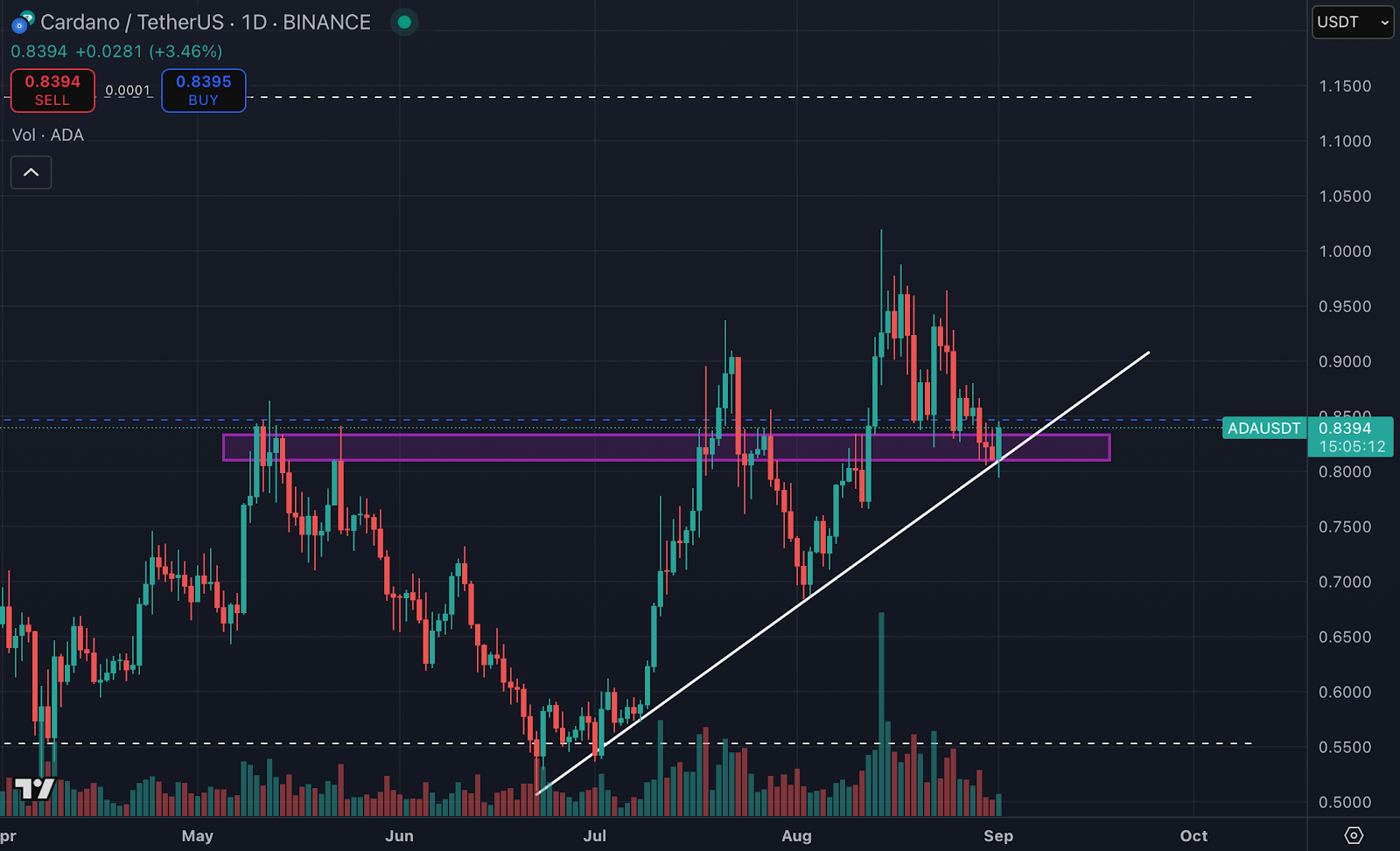 Der Cardano (ADA) Kurs zeigt heute eine bemerkenswerte Erholung. Trotz wochenlanger Rückgänge stieg der Preis heute Morgen um mehr als fünf Prozent auf 0,84 Dollar. Damit scheint ADA genau an einem kritischen Punkt zu stehen, an dem ein neuer Anstieg beginnen könnte.