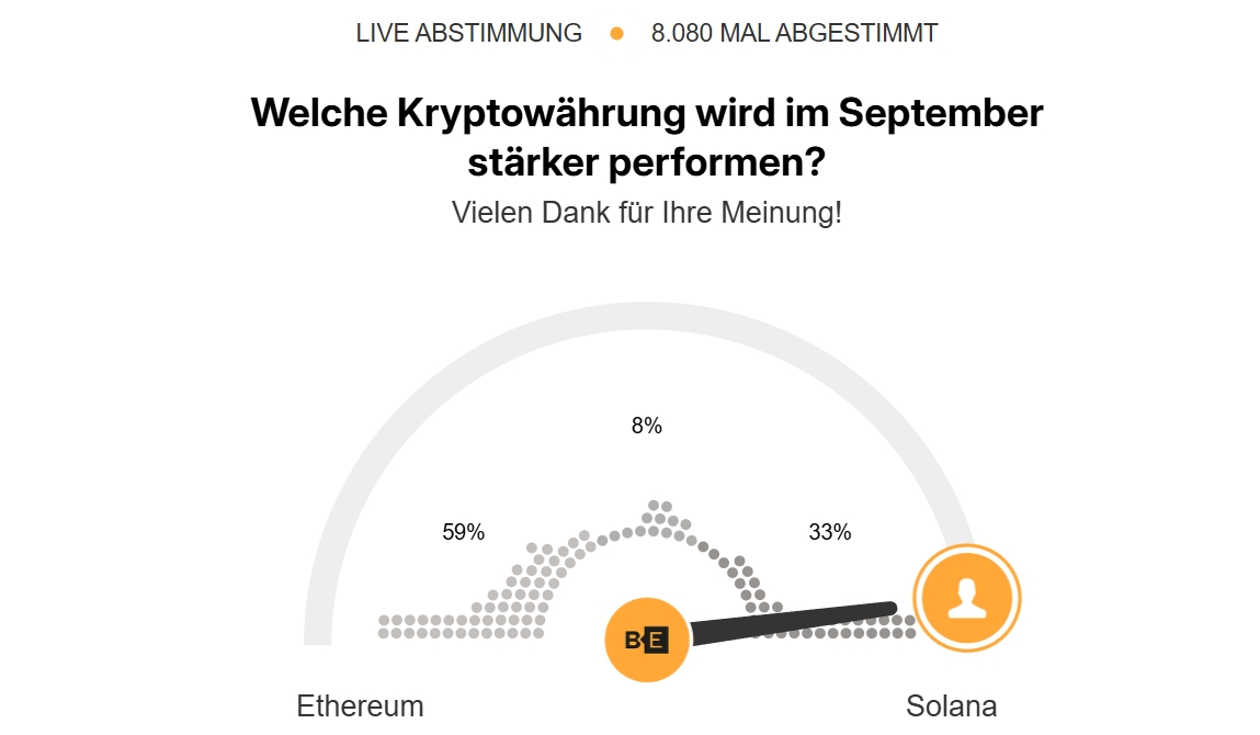 - Laut einer neuen BTC-ECHO Umfrage ist das eine klare Sache. Von 8.080 Teilnehmern vertreten 59 Prozent die Ansicht, dass der Ether-Kurs auch im September die Nase vorn haben wird. Nur 33 Prozent setzen hingegen auf jüngeren Herausforderer.