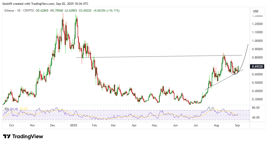 Das Muster signalisiert oft eine Fortsetzung des Aufwärtstrends, und ein Ausbruch des Kurses über 0,80 $ dürfte dies für Ethena bestätigen.