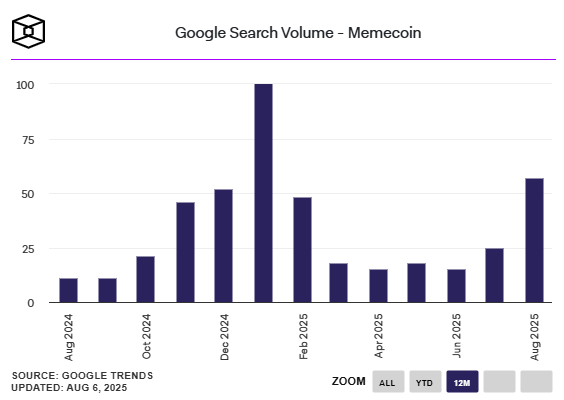 - Die Zahl der Web-Suchanfragen nach dem Begriff „Memecoin“ stieg nach Monaten geringen Interesses wieder stark an.