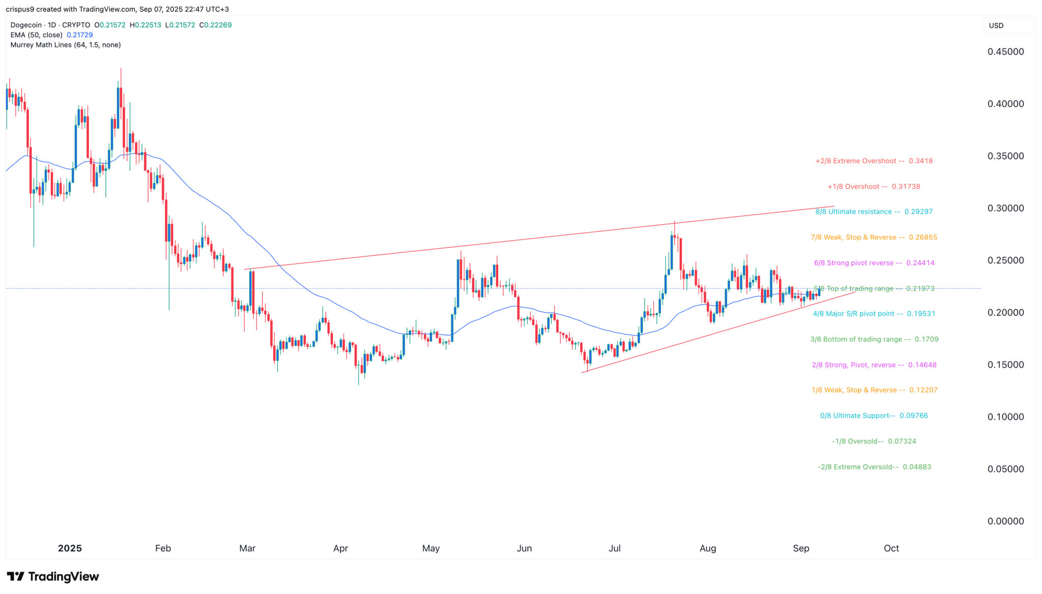 Das Tagesdiagramm zeigt, dass sich der DOGE-Kurs in den letzten Wochen in einer engen Spanne bewegt hat. Er wurde bei 0,2197 $ gehandelt und liegt damit leicht über der unteren Linie des aufsteigenden Kanals.