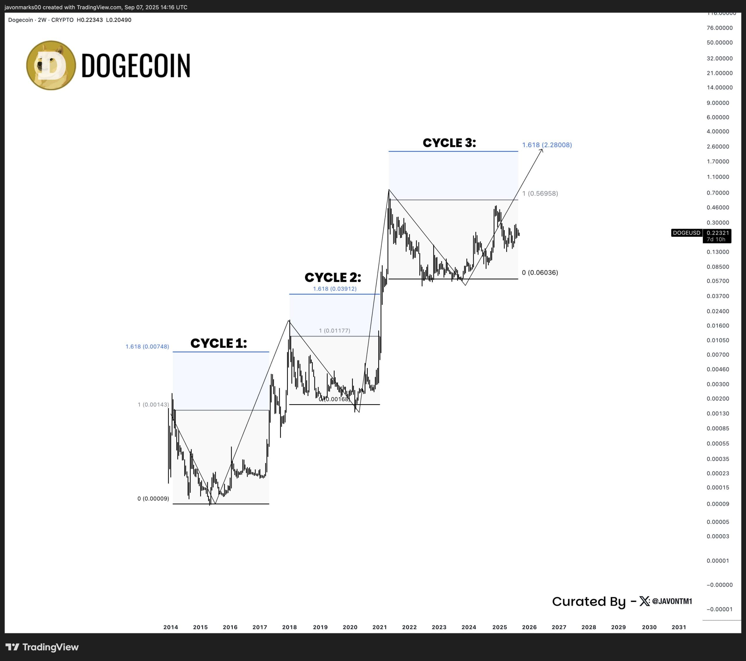 Der Analyst Javon Marks geht sogar noch einen Schritt weiter: Er nennt ein Mindestkursziel von 2,28 US-Dollar – „wenn nicht sogar deutlich mehr“, wie er schreibt. Seine Prognose basiert auf früheren Marktzyklen, in denen Dogecoin ähnliche Bewegungsmuster zeigte.