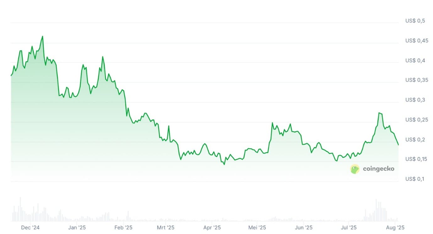 Laut Daten von CoinGecko konnte DOGE im Sommer zwar zulegen – in den letzten drei Monaten stieg der Kurs um über 20 %, im dritten Quartal bislang sogar um 40 %. Dennoch konnte diese Erholung den Abwärtstrend seit Dezember nicht ausgleichen.