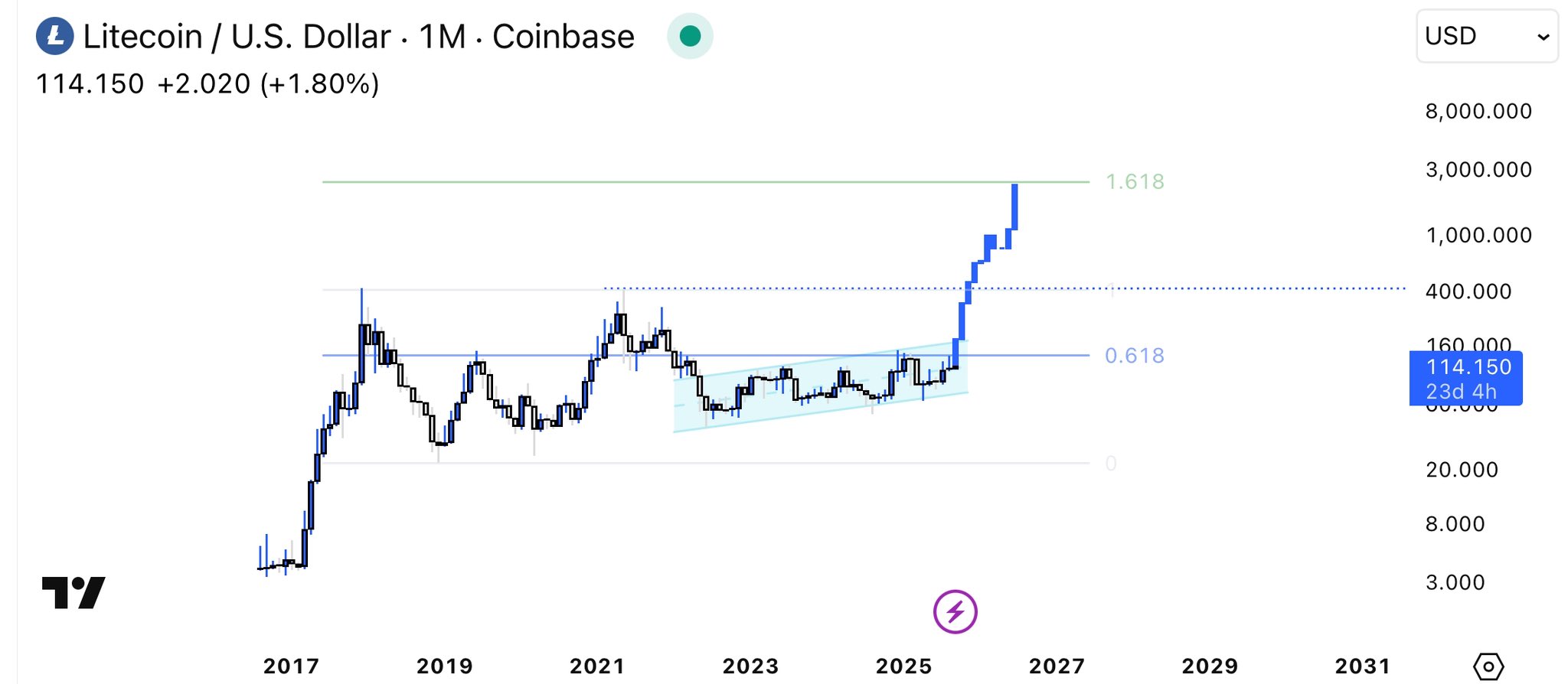 Prognosen zeigen Raum für größere Gewinne. Ein Analyst namens Vitruvius geht davon aus, dass der Token bis 2.500 Dollar steigen kann, wenn er seine Leistung aus dem Zyklus 2017 wiederholt. Sein Chart zeigt einen langfristigen Ausbruch nach jahrelangem Seitwärtshandel zwischen 40 und 150 Dollar, einer Spanne, die Litecoin mehrere Jahre hielt.