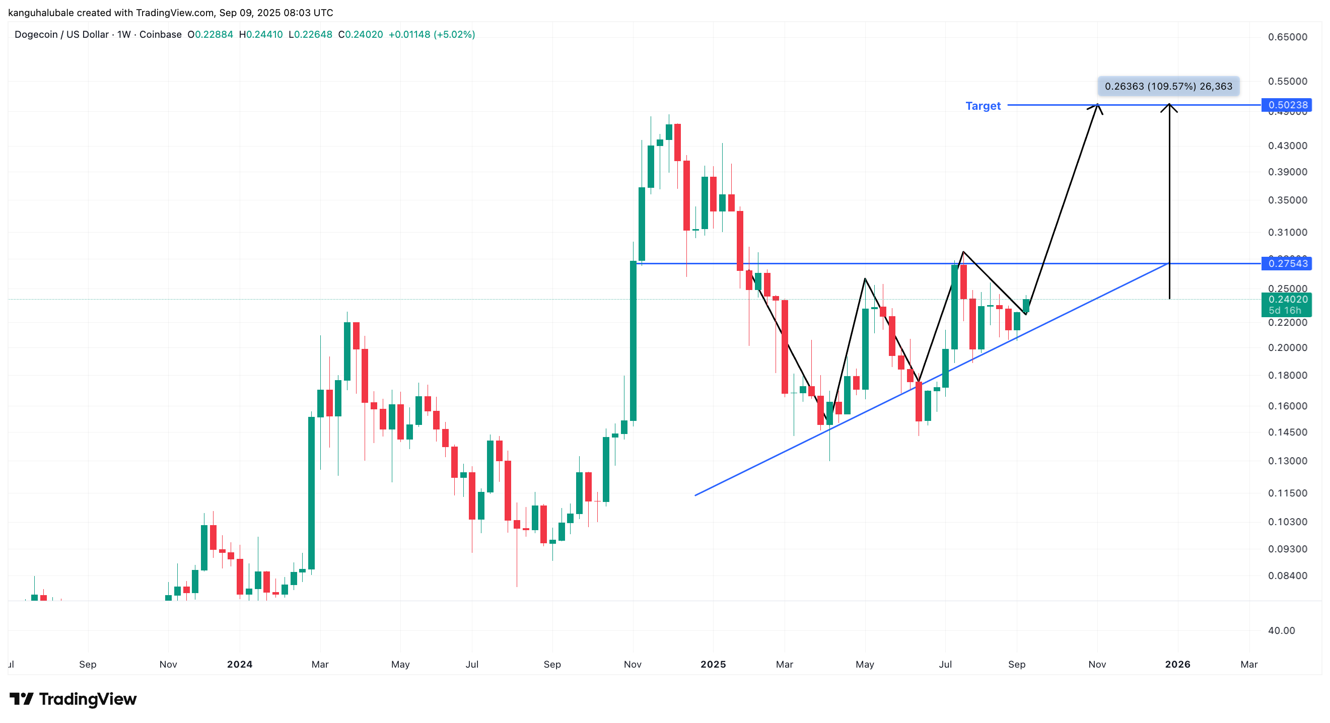 Die DOGE-Kurs-Charts weisen auf einen Ausbruch hin. Auf dem Wochenchart zeichnet sich ein aufsteigendes Dreieck ab, und Händler beobachten den Widerstand bei $0,27. Ein Wochenschlusskurs oberhalb dieser Marke würde eine zinsbullische Fortsetzung bestätigen und möglicherweise eine Rallye in Richtung $0,50 auslösen, was einen Anstieg von 110 % gegenüber dem aktuellen Niveau bedeuten würde.