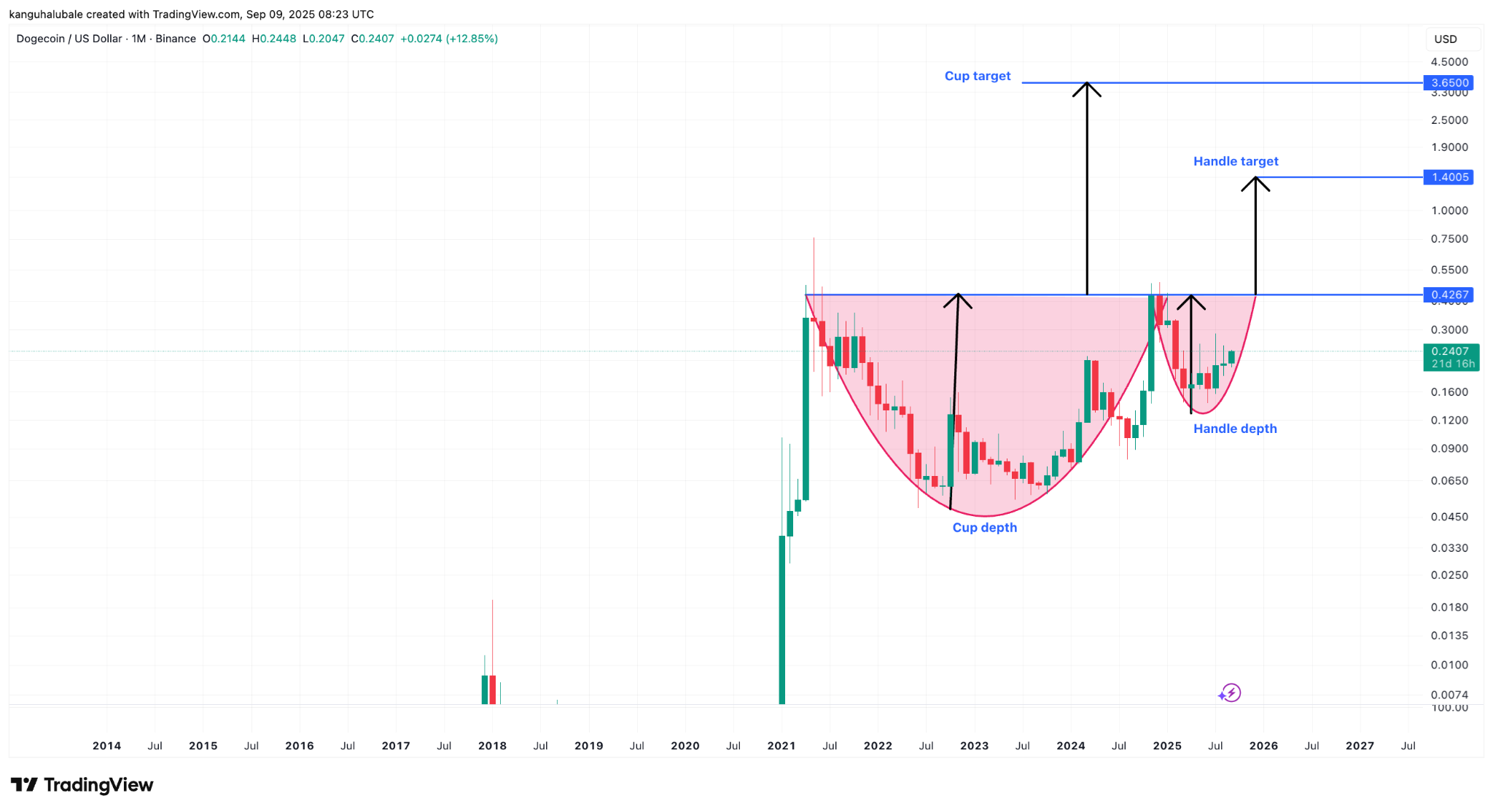 Die Aussichten auf den Monatscharts erscheinen stärker. Ein Tassen- und Henkelmuster deutet darauf hin, dass DOGE nach Überwindung des Widerstands bei 0,42 $ in Richtung 1,40 $ steigen könnte. Wenn die Dynamik anhält, deuten die Prognosen auf ein längerfristiges Ziel in der Nähe von 3,65 $ hin, was ein weiteres Aufwärtspotenzial unterstreicht, wenn die institutionelle Beteiligung am Markt weiter zunimmt.