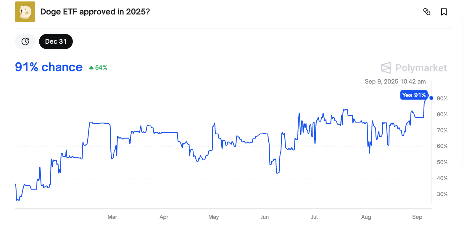 In der Zwischenzeit prüft die US-Börsenaufsicht SEC mehrere Anträge, darunter das Vorhaben von Grayscale, seinen Dogecoin Trust in einen ETF umzuwandeln. Die SEC wird bis Mitte Oktober entscheiden. Auf Polymarket sehen Händler eine 91%ige Chance für die Genehmigung eines Dogecoin-Spot-ETF im Jahr 2025, was den starken Optimismus auf den Prognosemärkten widerspiegelt.
