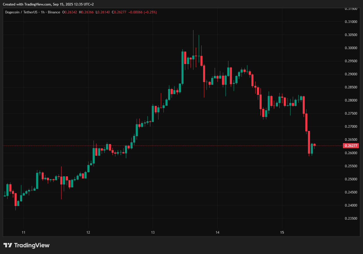 Doch heute hat sich die Stimmung gewendet. Innerhalb von 24 Stunden verlor DOGE 9,9 Prozent. Der Kurs fiel zurück auf 0,26 Dollar. Ein Schlag für jeden, der gerade eingestiegen war. Damit scheint die Memecoin erneut in schwerem Fahrwasser zu sein.