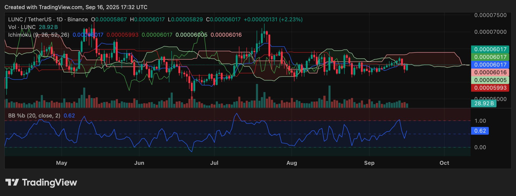 Marktweite Instrumente bestätigen das gemischte Bild. Die Bollinger Bänder zeigen eine sich verengende Volatilität um 0,000060 $, was auf eine bevorstehende Bewegung hindeutet. Der Ichimoku-Wolkenwiderstand bei 0,00006016 $ stellt eine wichtige Obergrenze dar.