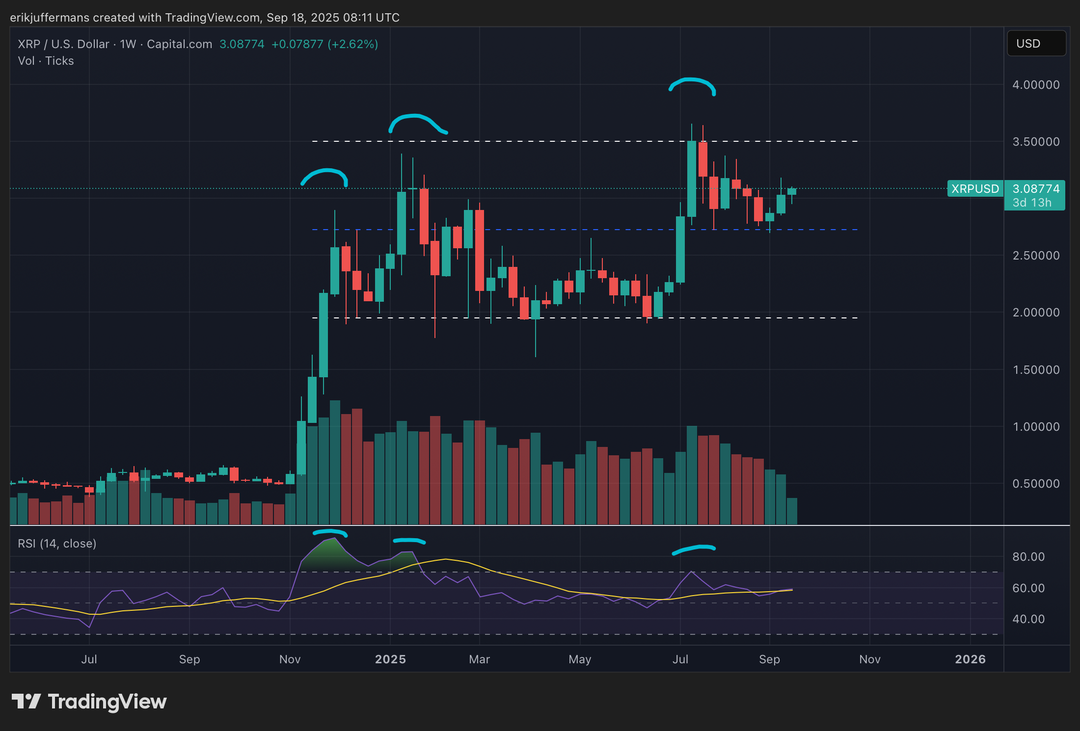 So eine bearish divergence geht oft einer Kursabnahme voraus. Und besonders, wenn wir so etwas auf dem wöchentlichen Diagramm sehen, müssen wir wachsam sein. Ein vierter höherer Höhepunkt ist sicherlich nicht ausgeschlossen. Der jüngste Höhepunkt bei 3,50 Dollar folgte nämlich auch auf eine bearish divergence. Sollte der Kurs in den kommenden Wochen/Monaten jedoch bei 3,50 Dollar abgelehnt werden, könnte das das Ende dieses XRP-Bullenmarktes bedeuten.