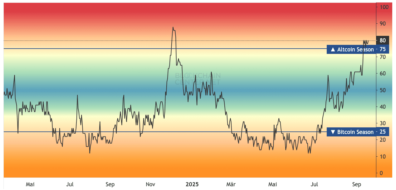 Die Kryptomärkte befinden sich aktuell in einer ausgeprägten Altcoin-Season, was sich deutlich am entsprechenden Index ablesen lässt. Nachdem der Altcoin-Season-Index im Juli noch bei niedrigen 12 Punkten notierte, erholte er sich im August kontinuierlich und überschritt im September erstmals wieder die kritische Marke von 75 Punkten. Heute bewertet der Index den Markt mit 80 Punkten, was eindeutig für eine Altcoin-Season spricht.