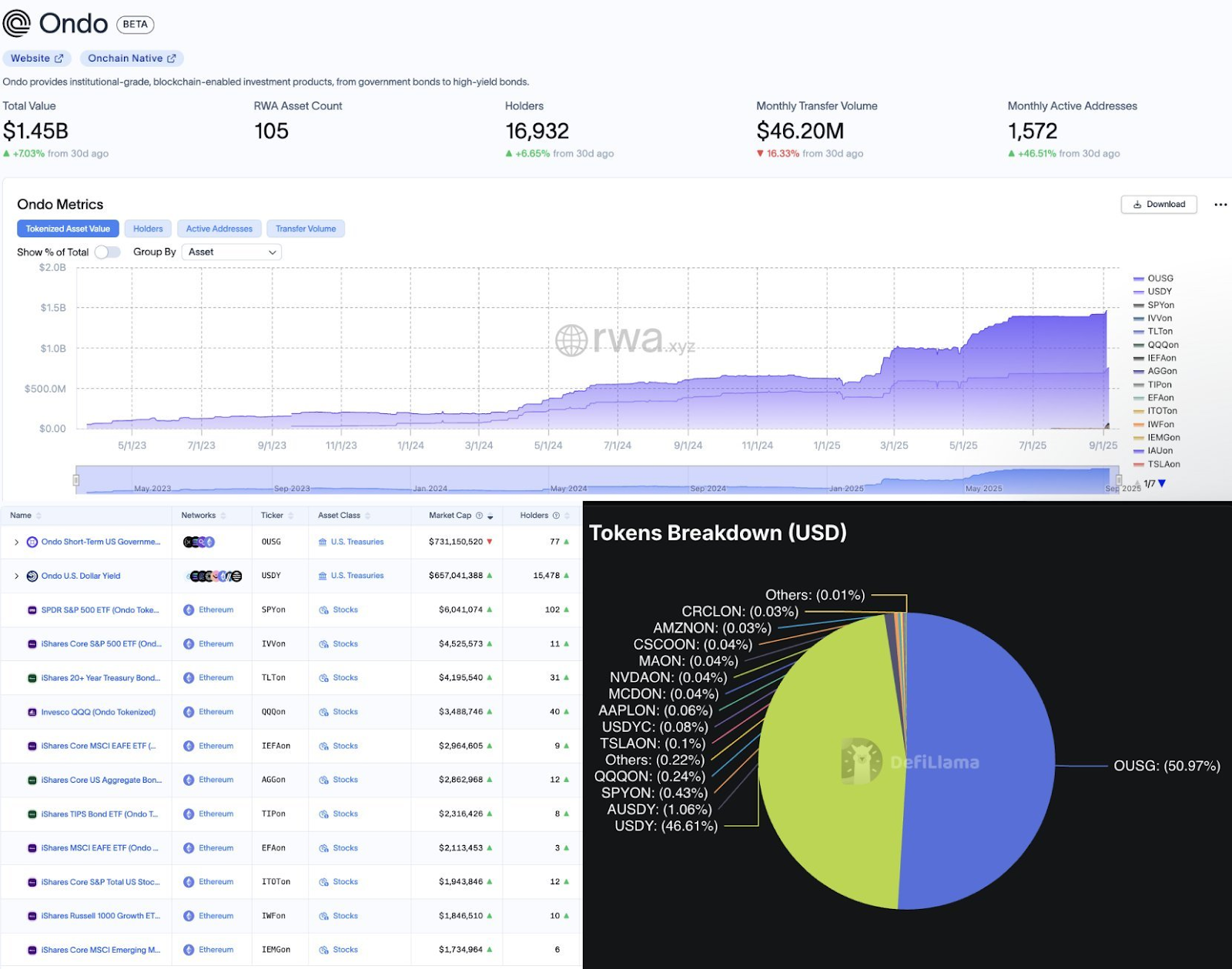 Das Ökosystem der Ondo-Plattform umfasst neben Staatsanleihen und Yield-Token eine Reihe verschiedener Vermögenswerte. Die Einführung von Global Markets ermöglichte kürzlich die Tokenisierung von US-Aktien und ETFs, was zu einem plötzlichen Anstieg der Gesamtzahl der Vermögenswerte beitrug.