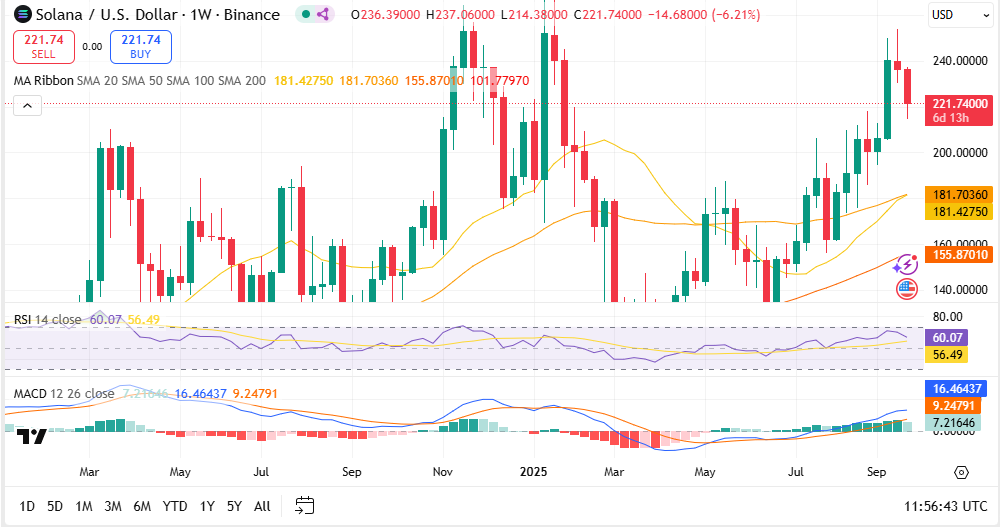 Solana wird bei 221,55 $ gehandelt, nachdem der Kurs in den letzten 24 Stunden um 8% gefallen war. Händler darüber debattieren, ob die nächste Bewegung einen Vorstoß in Richtung der 300 $-Zone auslösen wird.