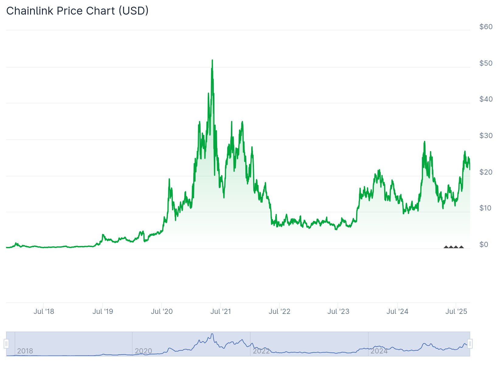 Nach der über 90-prozentigen Korrektur während des Bärenmarktes durchlief LINK seit 2024 drei größere Rallyphasen. Die erste erreichte im März 2024 einen Höchststand von 22,98 Dollar, die zweite führte im Dezember 2024 über die 30-Dollar-Marke. Die aktuell laufende dritte Phase brachte nach einem Rückfall auf unter 11 Dollar im Juli eine Erholung auf bis zu 27,72 Dollar im August. Seitdem hat das Momentum jedoch nachgelassen, was zu einem 14,33-prozentigen Monatsrückgang und einem gestrigen Tiefstand bei 21 Dollar führte.