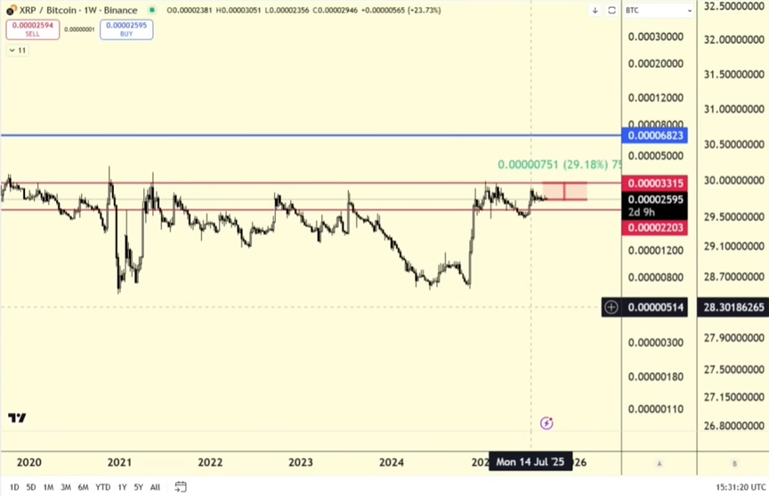 Im Gespräch mit Paul Barron wies Dennis auf das Verhältnis zwischen XRP und Bitcoin hin. Für ihn ist es entscheidend, dass XRP das Niveau von 0,000033 BTC zurückgewinnt, den Höhepunkt des letzten Zyklus im Jahr 2020. „Wenn Bitcoin auf 150.000 Dollar steigt, sehe ich XRP am Ende dieses Jahres bei etwa 4,50 Dollar,“ sagte er.