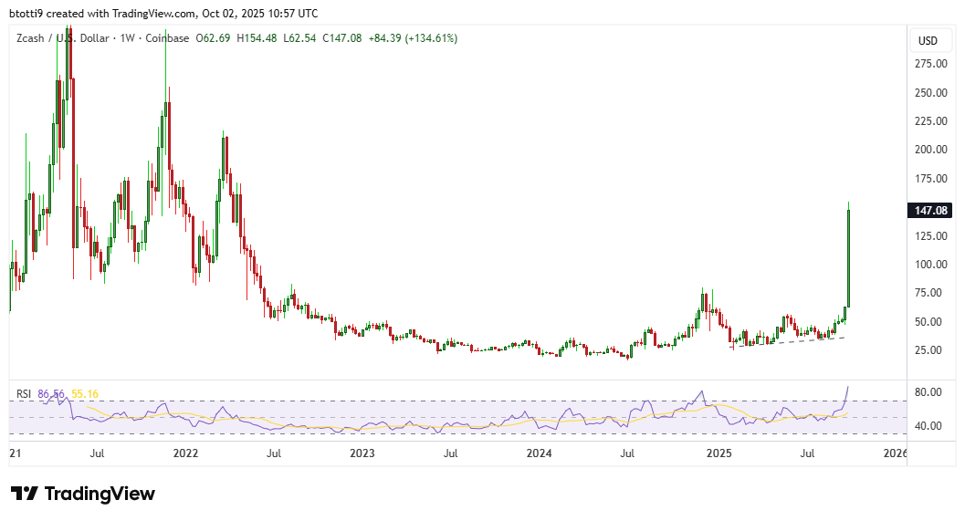 - Zcash wurde am Donnerstag, den 2. Oktober 2025, über 145 $ gehandelt, wobei der Privacy Coin in den letzten 24 Stunden einen Anstieg von 57% verzeichnete.
