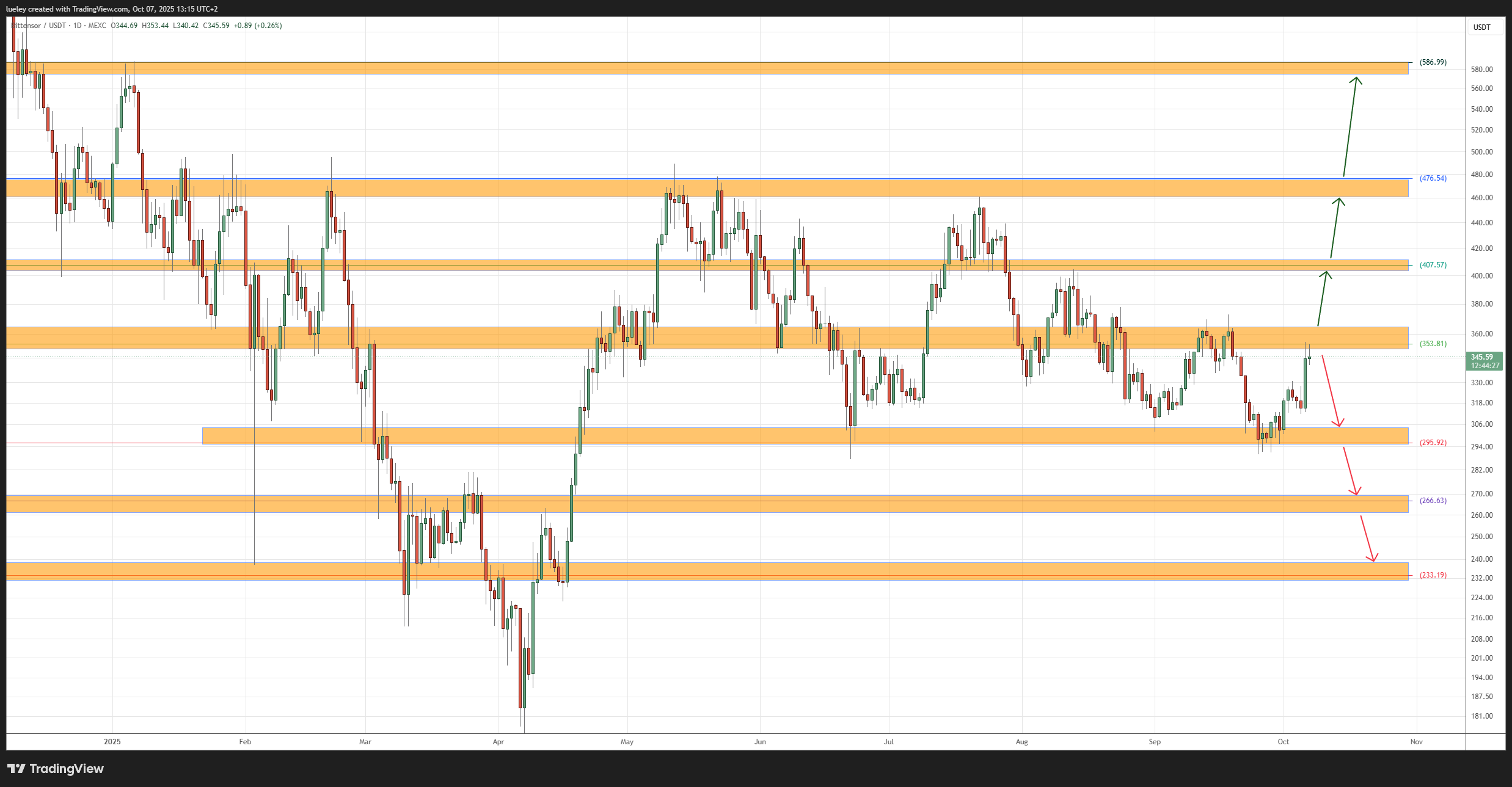 - In Folge des bullishen Anstiegs der letzten Tage hievte das Käuferlager den Kurs auf ein neues Monatshoch bis in die Widerstandszone um das Vormonatshoch bei 353 US-Dollar. Gelingt es der Käuferseite, die Zone um die Zwischenhochs aus dem September nachhaltig zu durchbrechen, dürfte der Kurs in Richtung 407 US-Dollar zulegen. Hier scheiterte Bittensor im August.