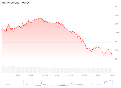 Der XRP-Kurs liegt zum Zeitpunkt des Schreibens bei 2,43 US-Dollar. Das sind 5,68 Prozent weniger als gestern und gut 18 Prozent weniger als vor einer Woche. Die gesamte Marktkapitalisierung beläuft sich auf 145,45 Milliarden US-Dollar, deutlich weniger als die 178,96 Milliarden US-Dollar der Vorwoche.