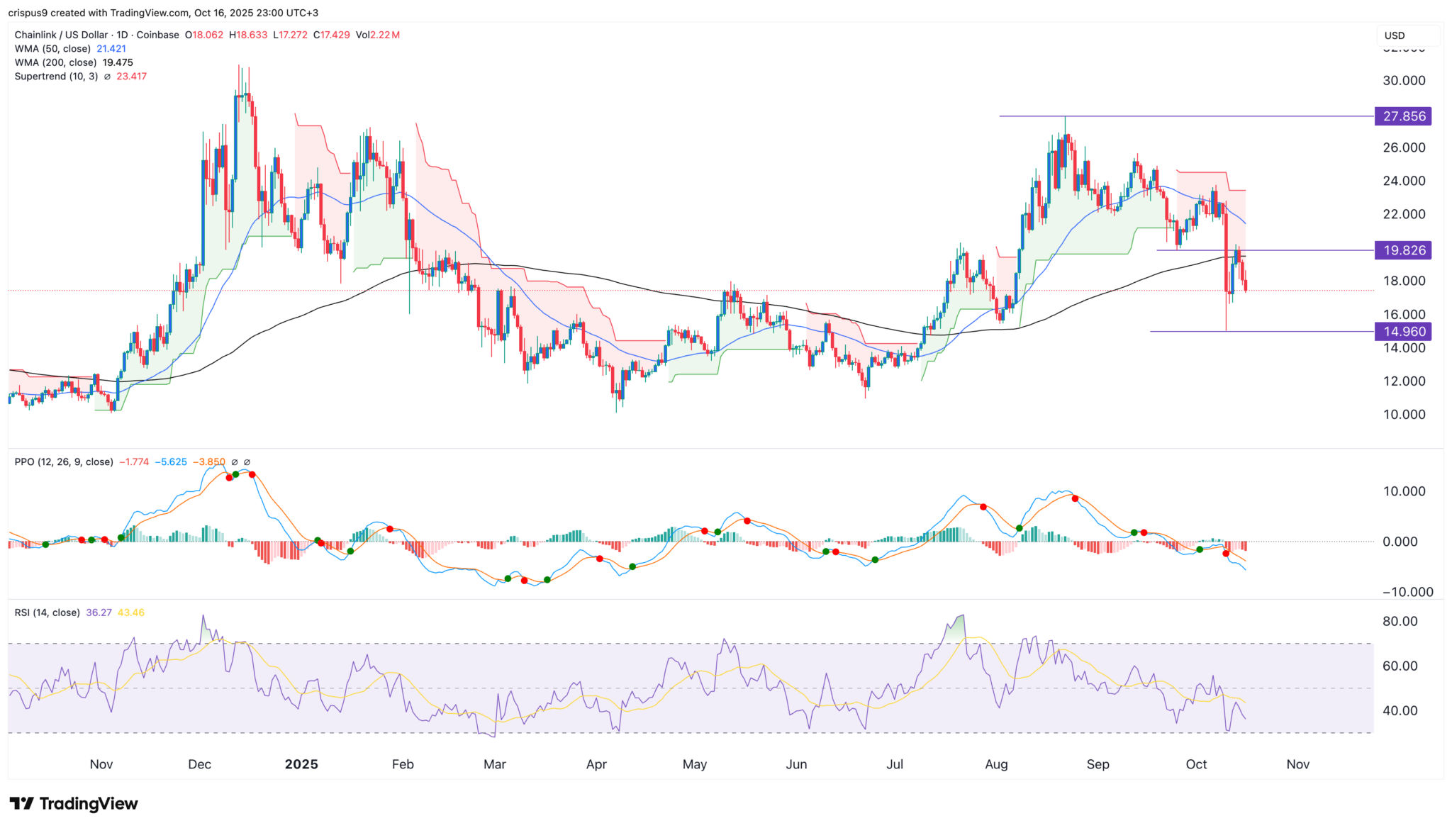 Der Chainlink-Kurs ist von einem Höchststand von 27,85 $ am 22. August auf aktuell 17,5 $ gefallen. Er hat die wichtige Unterstützung bei 19,82 $ unterschritten, die am 25. September ihren Tiefststand erreichte. Dieser Absturz machte das sich bildende Doppel-Boden-Muster ungültig.
