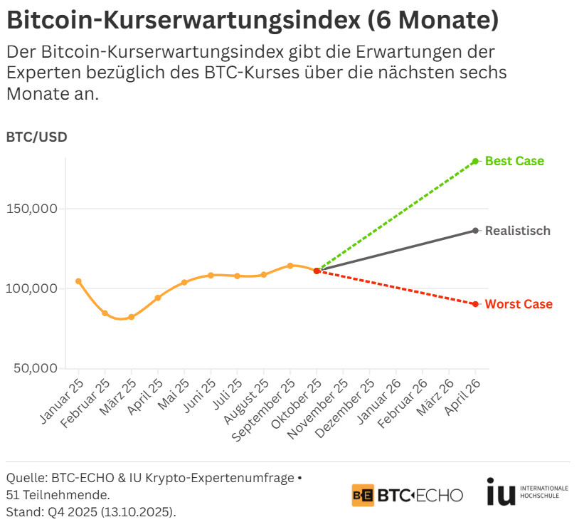 Insgesamt zeigt die 6-Monats-Befragung einen Aufschwung gegenüber dem vorherigen Quartal. Damit nehmen die Experten angesichts des neuen Allzeithochs im Oktober, das bei 126.198 US-Dollar liegt, eine noch bullishere Haltung ein.