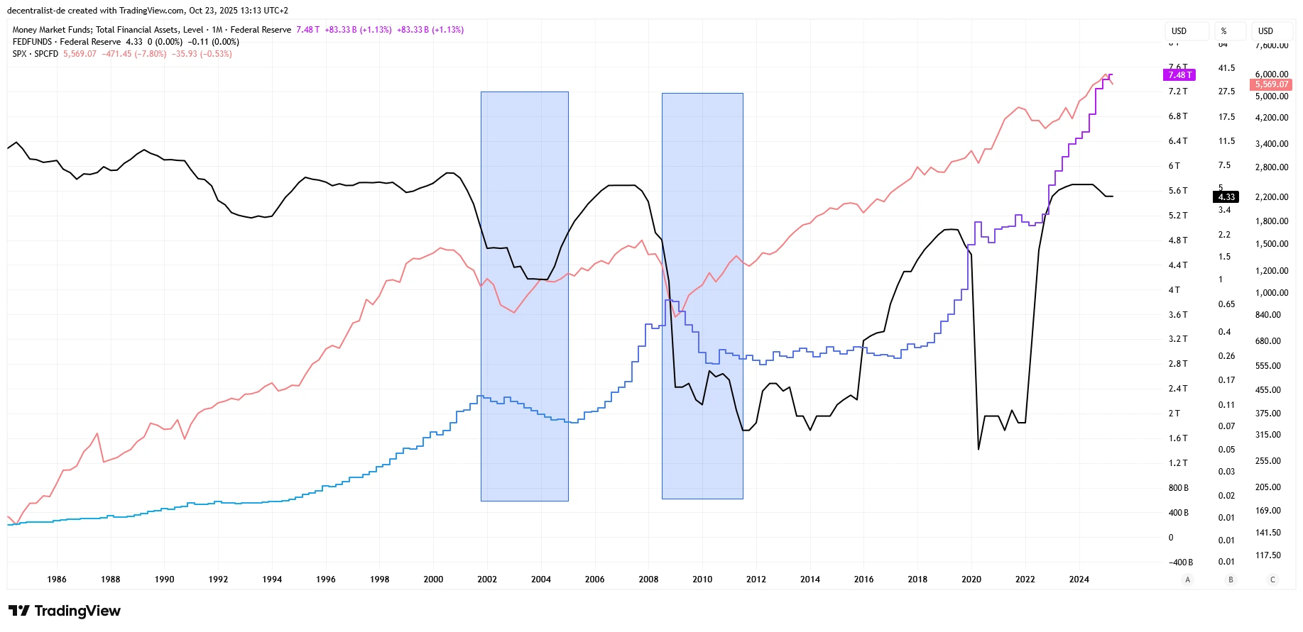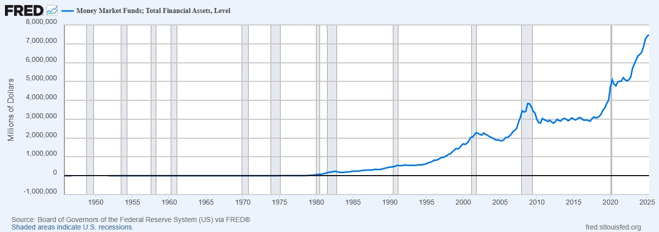 Die geldpolitischen Exzesse der letzten Jahrzehnte haben zudem zu einem weiteren Umstand geführt, der in einer größeren Zinssenkungsphase relevant wird: es steckt bereits eine gigantische Menge Kapital im System, das seinen Weg jedoch noch nicht in Vermögenswerte gefunden hat. In Geldmarktfonds schlummert eine gewaltige Kapitalmenge von knapp 7,5 Billionen Dollar. Eine deutliche Veränderung des Zinsniveaus kann zu einer Kapitalrotation führen und erhebliche Auswirkungen auf die Märkte haben.