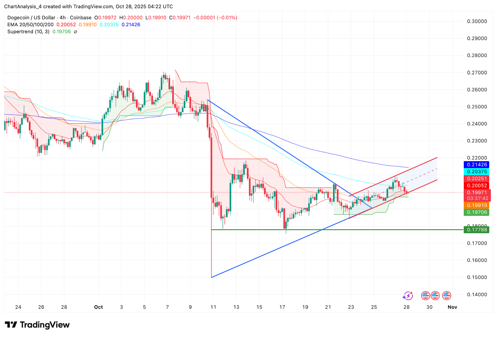 Auf dem 4-Stunden-Chart befindet sich der Dogecoin-Kurs in einem engen aufsteigenden Kanal, nachdem er von seinen Oktober-Tiefs Boden zurückerobert hat. Die EMAs zwischen 20, 50 und 100 $ zwischen 0,199 $ und 0,203 $ sind zu einem kompakten Unterstützungscluster verschmolzen, den Händler aktiv verteidigen.