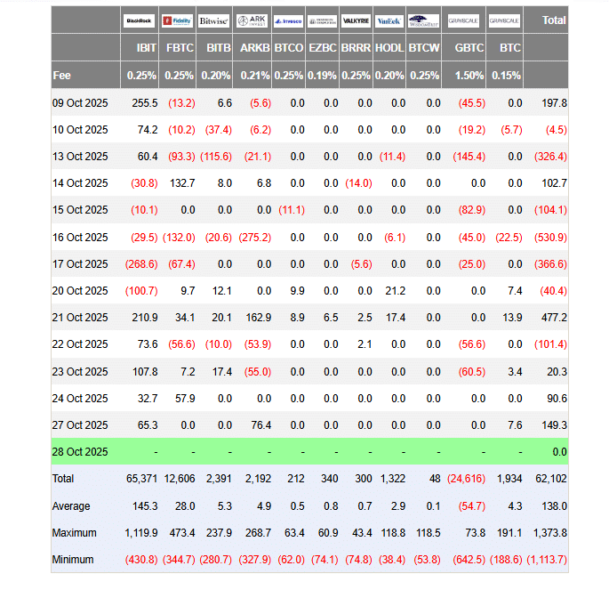 ETFs haben Milliarden in Bitcoin investiert, Quelle: https://farside.co.uk/btc/