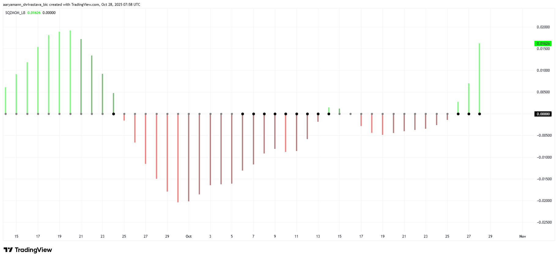 Der Squeeze Momentum Indicator zeigt, dass sich Hedera derzeit in einer Aufbauphase befindet, nachdem der Token über einen Monat lang relativ inaktiv war. Diese Phase wird durch das Erscheinen schwarzer Punkte im Chart gekennzeichnet, was eine Komprimierung der Volatilität signalisiert. Historisch gesehen gehen solche Squeeze-Phasen größeren Ausbrüchen voraus, sobald sich das Momentum in eine bullische oder bärische Richtung verschiebt.