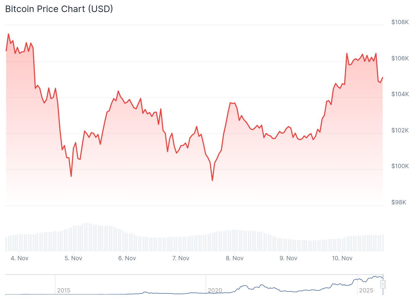 Mit der Eröffnung der US-Aktienbörsen tauchte der Kurs unter 105.000 Dollar. Das ist bemerkenswert, da der Aktienmarkt mit sattem Plus eröffnete.