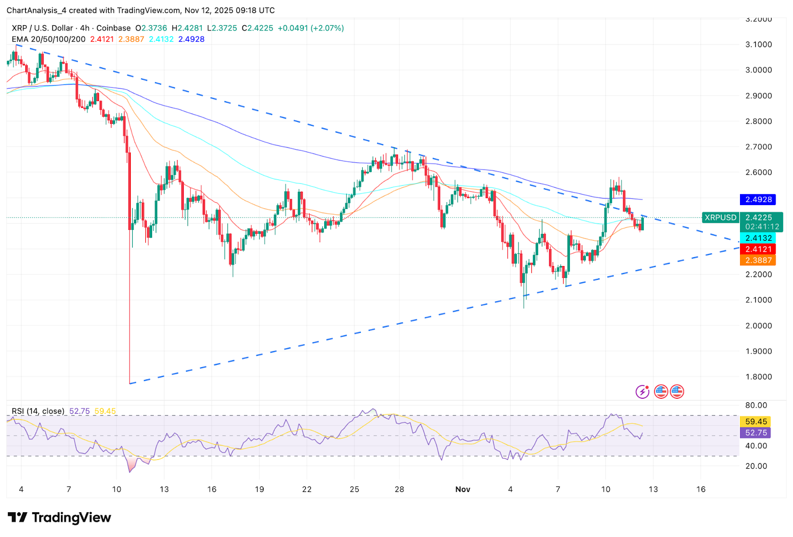 Auf dem 4-Stunden-Chart handelt XRP innerhalb eines symmetrischen Dreiecks, das sich seit Anfang Oktober verengt hat. Der Token stößt auf Widerstand am 200-EMA (2,49 $), der in diesem Monat jede größere Erholung gedeckelt hat. Ein Durchbruch und Schlusskurs über diesem Niveau würde wahrscheinlich neue Käufer anziehen.