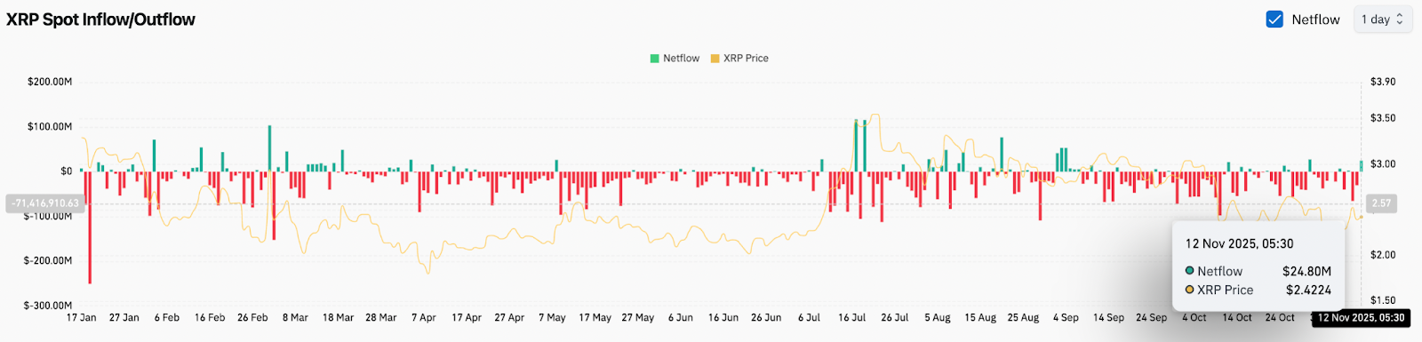 On-Chain-Daten von Coinglass zeigen am 12. November Nettozuflüsse in Höhe von 24,8 Mio. $, was eine kurzfristige Verschiebung von Wochen anhaltender Abflüsse darstellt. Dies deutet darauf hin, dass Händler XRP allmählich von den Börsen entfernen, was eine Tendenz zur Akkumulation signalisiert.