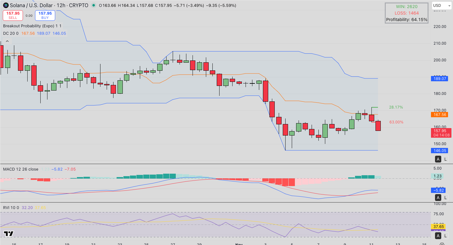 Solana wird derzeit um 158,37 $ gehandelt und weitet damit seinen Tagesrückgang von 5,34% aus, nachdem es in der Nähe des kurzfristigen Widerstands auf Ablehnung gestoßen war. Das 12-Stunden-Chart zeigt, dass SOL zwischen der unteren Unterstützung des Donchian-Kanals bei 146,05 $ und dem Mittellinienwiderstand bei 167,56 $ schwankt, einer Spanne, die das Seitwärtsmomentum des Vermögenswerts in den letzten Sitzungen definiert hat.