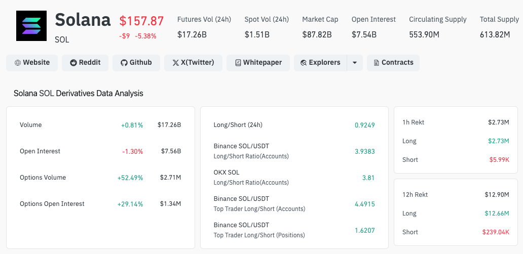 Nach der Ankündigung zeigen die Daten von Coinglass , dass das Handelsvolumen der SOL-Futures um 0,81% auf 17,26 Mrd. $ gestiegen ist, während das gesamte Open Interest um 1,30% auf 7,56 Mrd. $ gesunken ist, da die Händler ihre Positionen neu ausbalancierten. Insbesondere das Handelsvolumen mit Optionen stieg um 52,49 % auf 2,71 Mio. $, und das Open Interest für Optionen stieg um 29,14 % auf 1,34 Mio. $, was die erhöhte spekulative Aktivität und die Absicherungsnachfrage rund um die Preisaussichten von Solana unterstreicht.