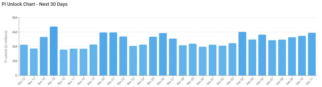 Die tägliche durchschnittliche Freischaltung liegt bei 4,85 Millionen PI, was einem potenziellen neuen Angebot von 1,1 Millionen US-Dollar entspricht. Die größte eintägige Freischaltung, die für den 15. November erwartet wird, beläuft sich auf Token im Wert von rund 1,54 Millionen US-Dollar.