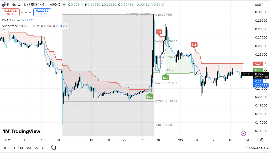 Nachdem er sich von der Fibonacci-Unterstützung bei 0,216 $ erholt hatte, kletterte Pi kurzzeitig auf 0,297 $, bevor er wieder zurückging. Das jüngste Retracement fand bei 0,232 $ Halt und stimmte damit mit dem 38,2% Fibonacci-Level überein. Dieser Bereich fungiert nun als wichtige Verteidigungszone für Käufer, wobei sich das kurzfristige Momentum über dem 9-Perioden-EMA bei 0,227 $ stabilisiert.