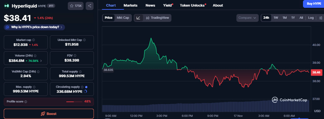 HYPE blieb in den letzten 24 Stunden relativ stabil und verlor nur 1,40% und notierte bei 38,41 $.